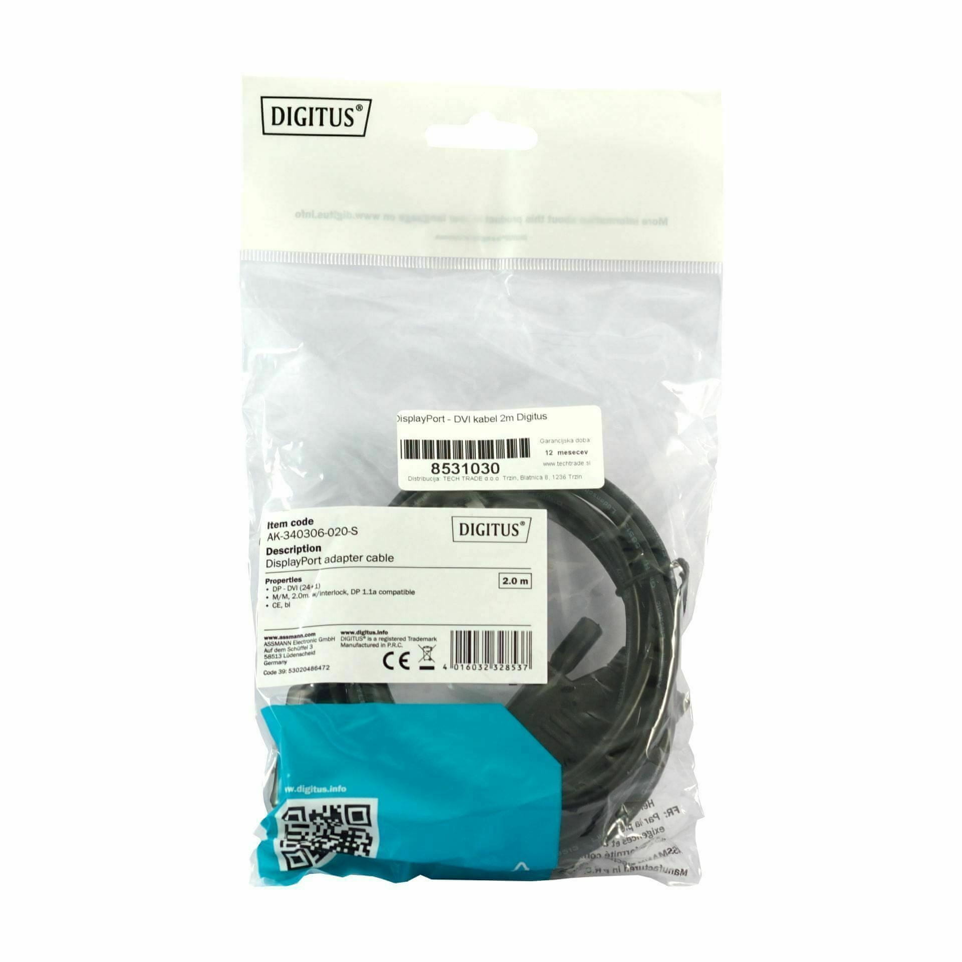 Digitus kabel za prijenos slike iz DisplayPort sučelja na DVI zaslon/projektor, duljina kabla 2m, crne boje.