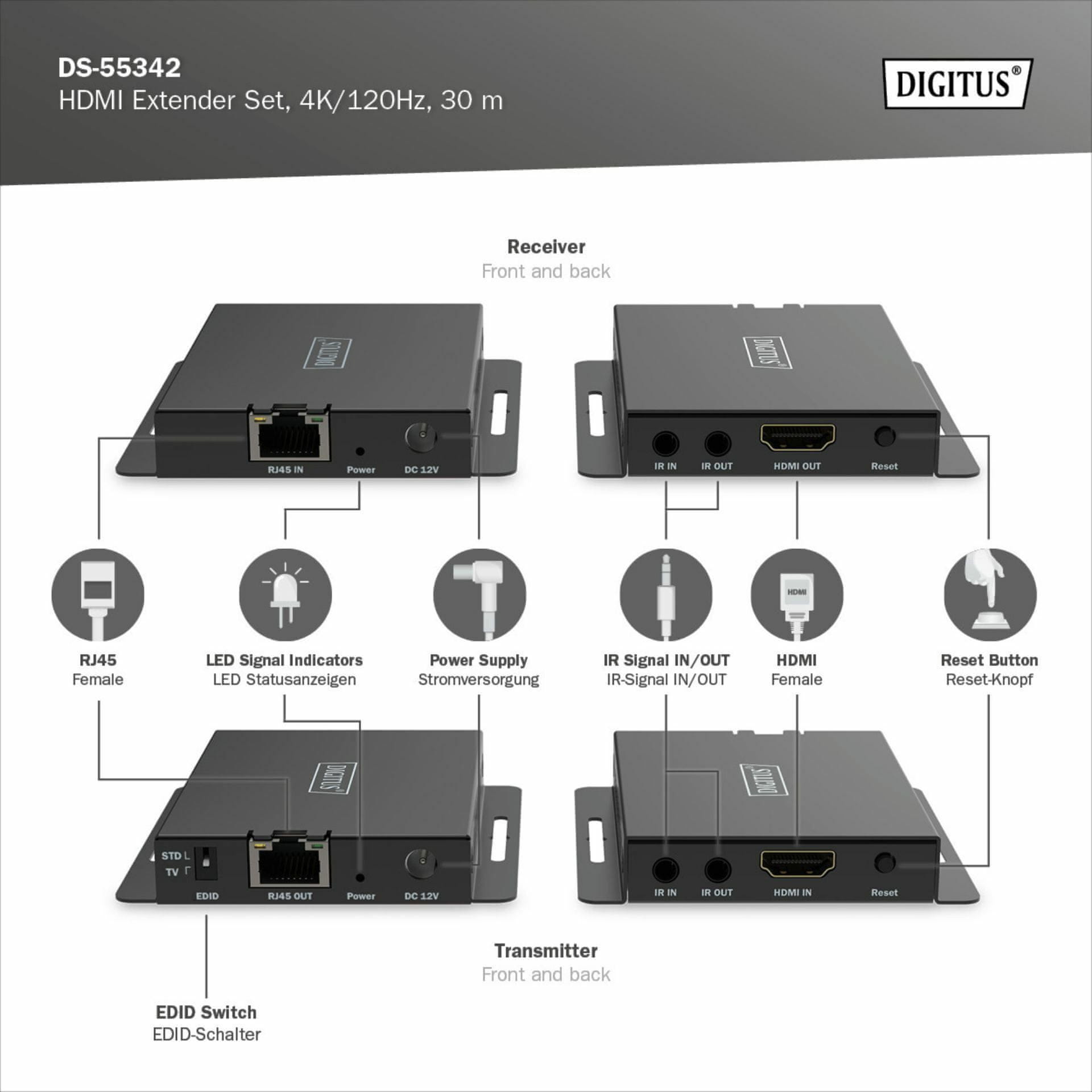 DIGITUS produžni HDMI+IR RJ45-RJ45 omogućava prijenos HDMI signala na udaljenost do 30 m (4K/120Hz, 4:4:4) korištenjem CAT 6 ili viših kabela. Također podržava dvosmjerni IR prijenos. Pogodan je za montažu na zid te nudi fleksibilne opcije postavljanja.