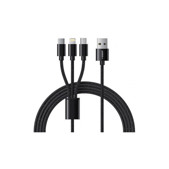 VEGER V303 pleteni kabel 3v1 USB-A na USB-C/Lightning/MicroUSB, 1,5m, crn