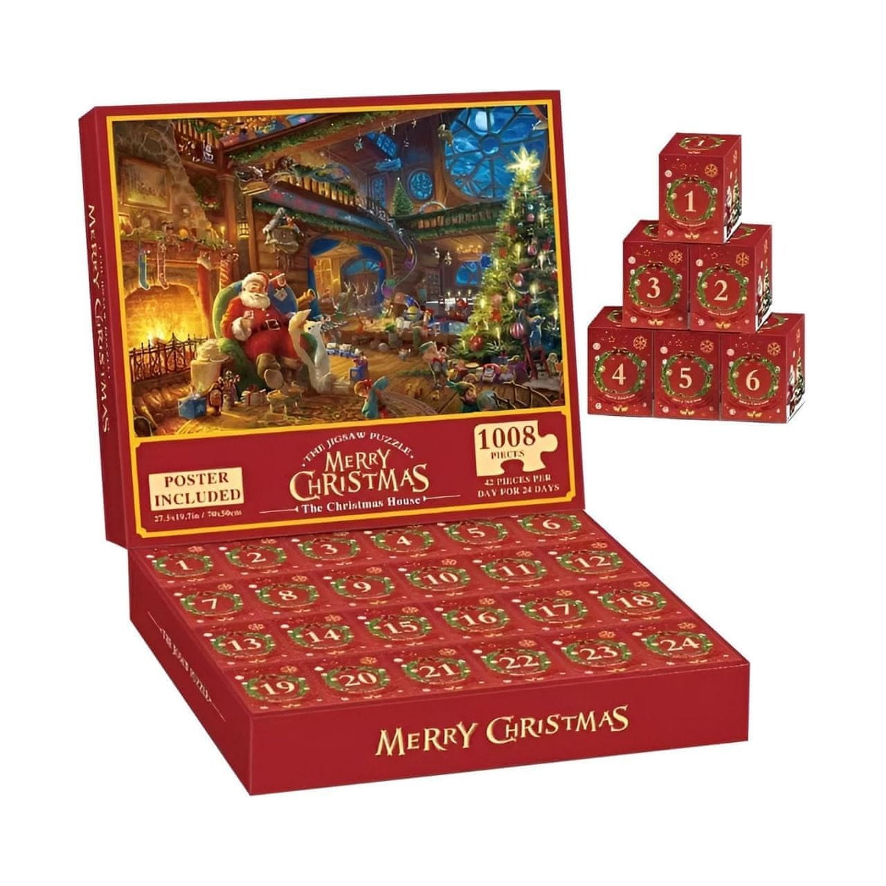 Netscroll Božićni adventski kalendar s puzzlama – 1008 dijelova, 24-dnevno božićno odbrojavanje i slaganje, svaki dan slažete jedan dio slagalice, PuzzleAdvent
