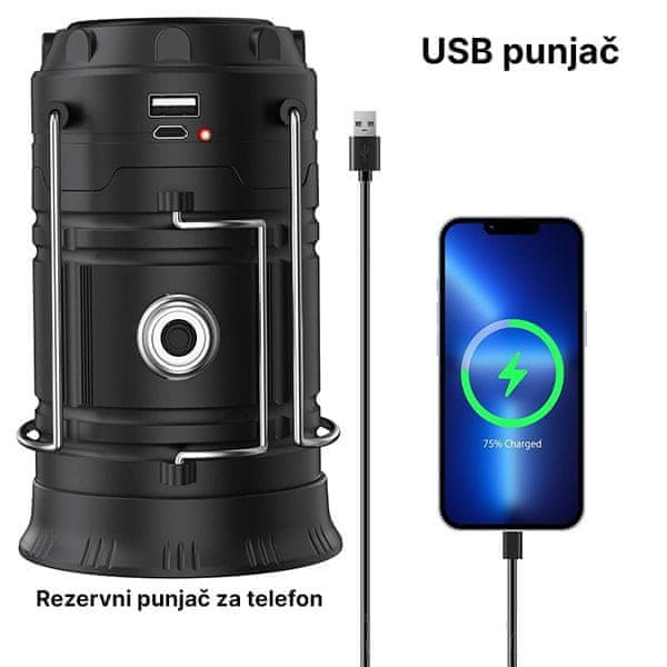 Držite svoju svjetiljku napunjenom uz dvije praktične opcije: solarno napajanje i USB punjenje. Ugrađene solarne ćelije na vrhu svjetiljke omogućuju ekološki prihvatljivo punjenje, dok uključeni USB kabel nudi brzu i pouzdanu alternativu. Ova dvostruka funkcionalnost osigurava da uvijek imate rezervnu opciju, bilo da ste izvan mreže ili blizu izvora napajanja.