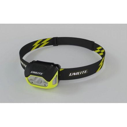 LED naglavna svjetiljka marke Unilite sa svjetlosti od 475 lm i USB punjenjem. Ima senzor za uključivanje i bočno LED svjetlo. Cijeli opis