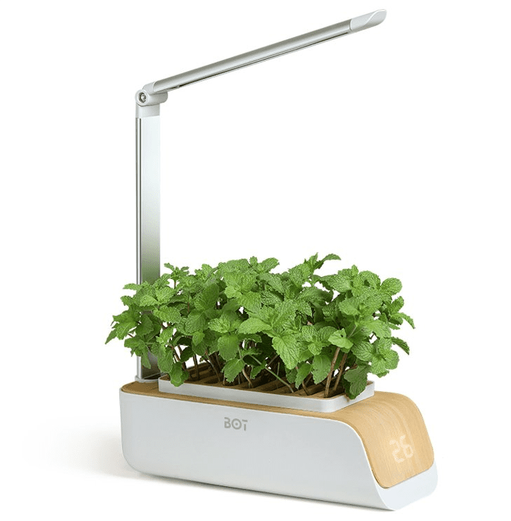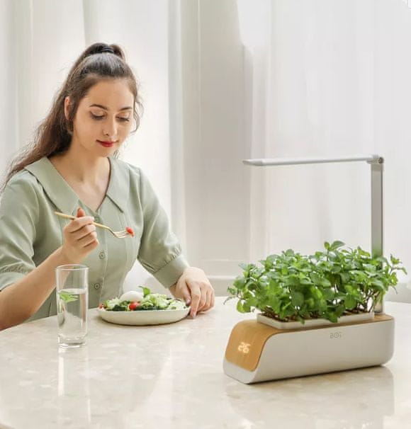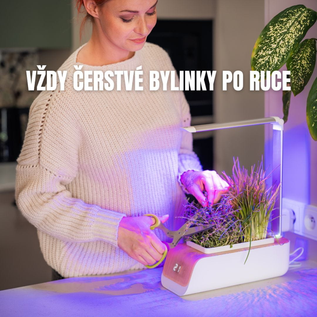 Ova posuda je mali saksijski box s ugrađenim osvjetljenjem i zalijevanjem gdje možete uzgajati širok izbor biljaka, cvijeća, začinskog bilja i povrća. Box prima 2 sjemenke pa možete kombinirati više biljaka u jednoj posudi. Dizajnirana je da bude samozalijevajuća i može držati dovoljno vode za pravilno zalijevanje sjemenki oko mjesec dana. Posebno LED rastuće svjetlo omogućava podešavanje visine kako biljke rastu.