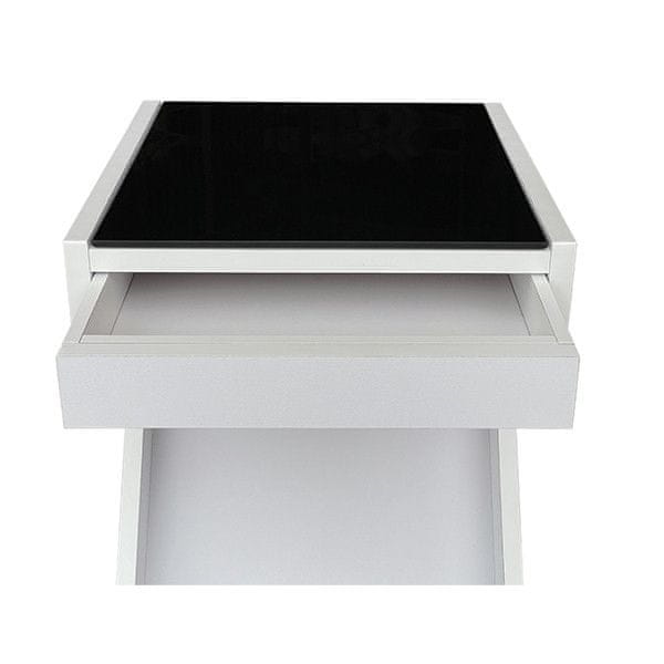 Jednostavan moderni KLUBSKI STOL BLAIR zadivit će vas svojom kompaktnošću i zanimljivim dizajnom. Izrađen je od medijapana u bijeloj boji i ima ploču od crnog kaljenog stakla na vrhu. Poseban oblik i dimenzije omogućuju vam korištenje stola na različitim mjestima u vašem domu i da ga maksimalno iskoristite. Jedna mala ladica i polica na koju možete staviti novine, časopise ili knjige pružaju dovoljno prostora za pohranu. Jednostavno, moderno i funkcionalno!