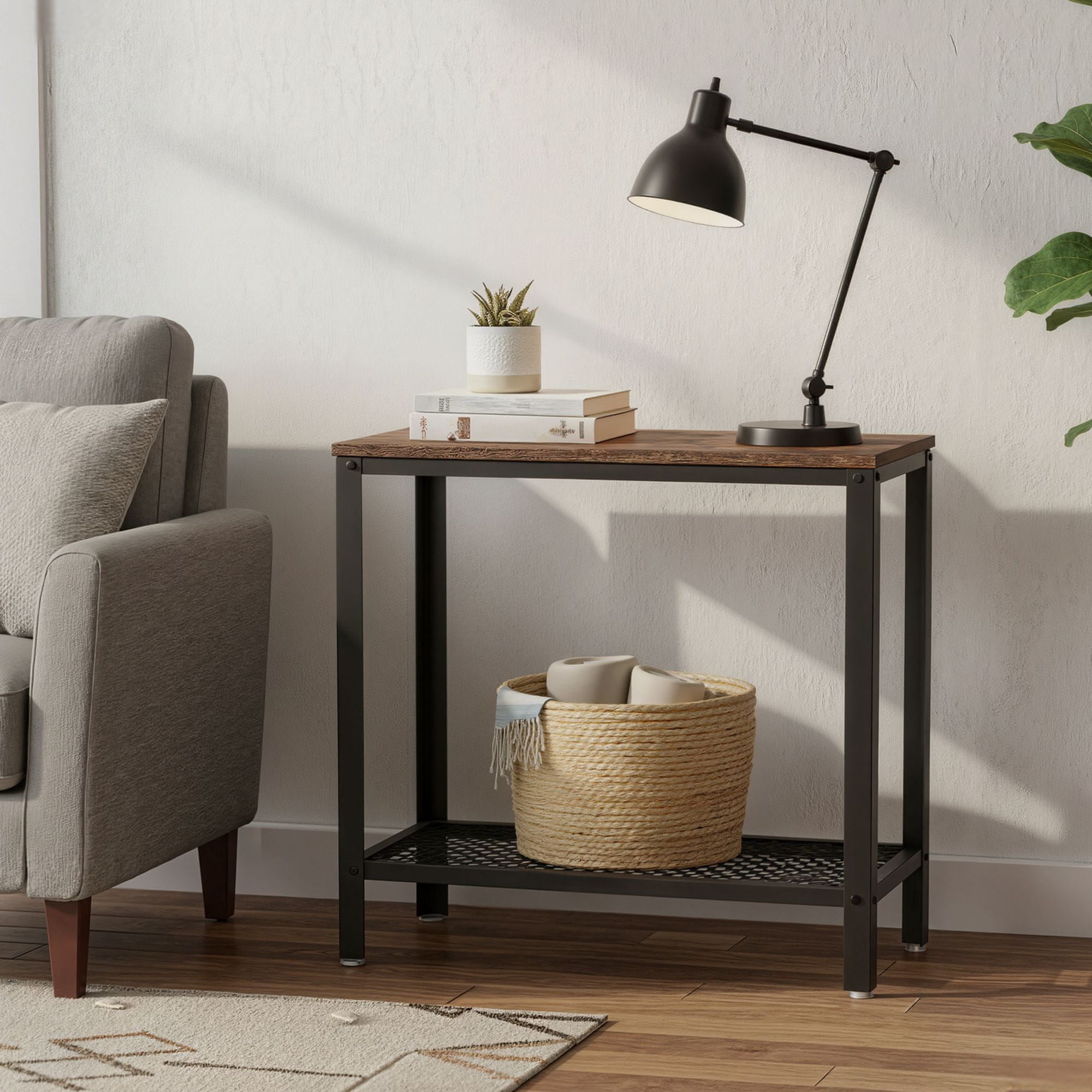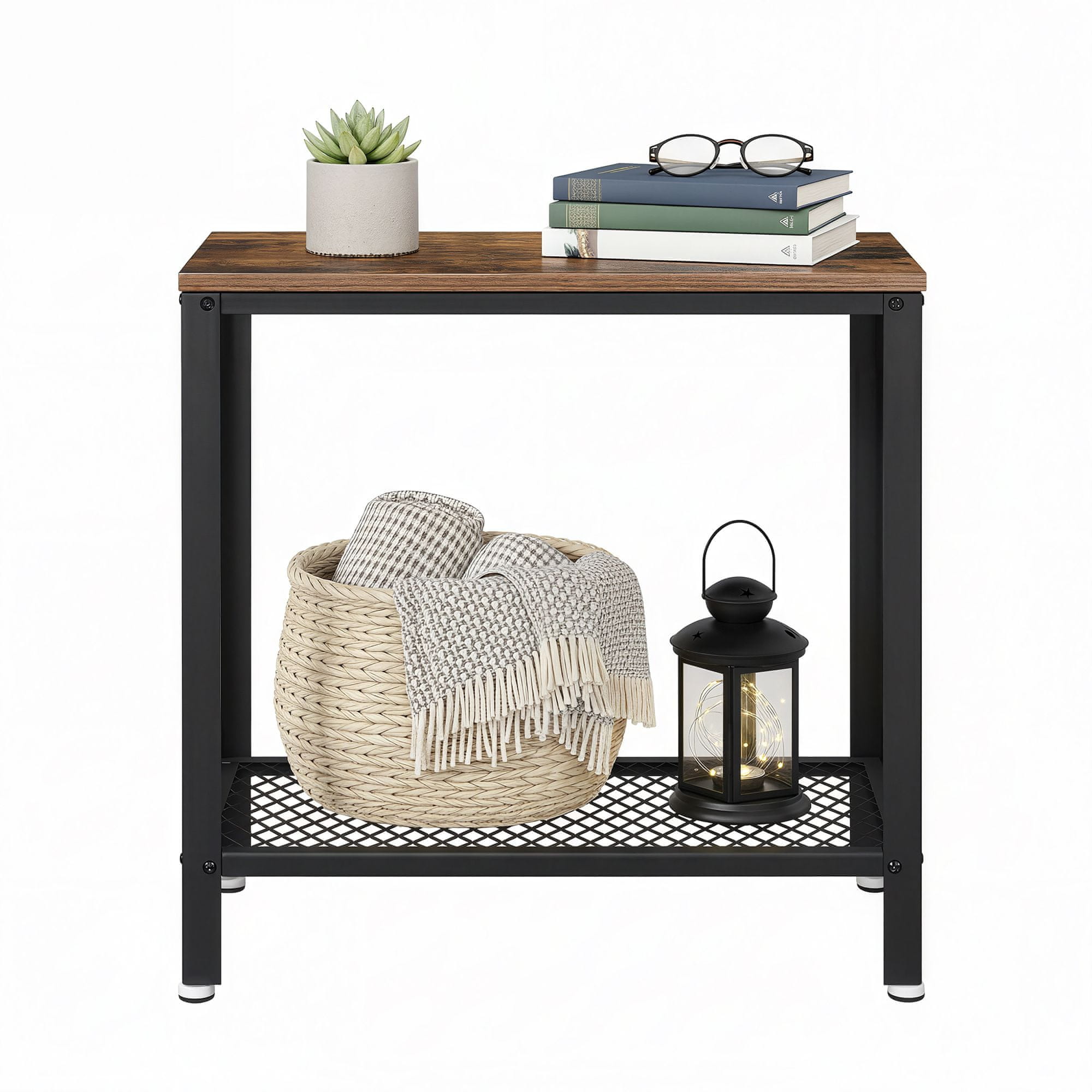 Ovaj stolić industrijskog stila nudi kompaktno rješenje za male prostore, što ga čini idealnim kao pomoćni stolić ili noćni ormarić. Njegov čvrst dizajn omogućuje praktično odlaganje knjiga, grickalica ili dekorativnih predmeta u svakoj prostoriji.