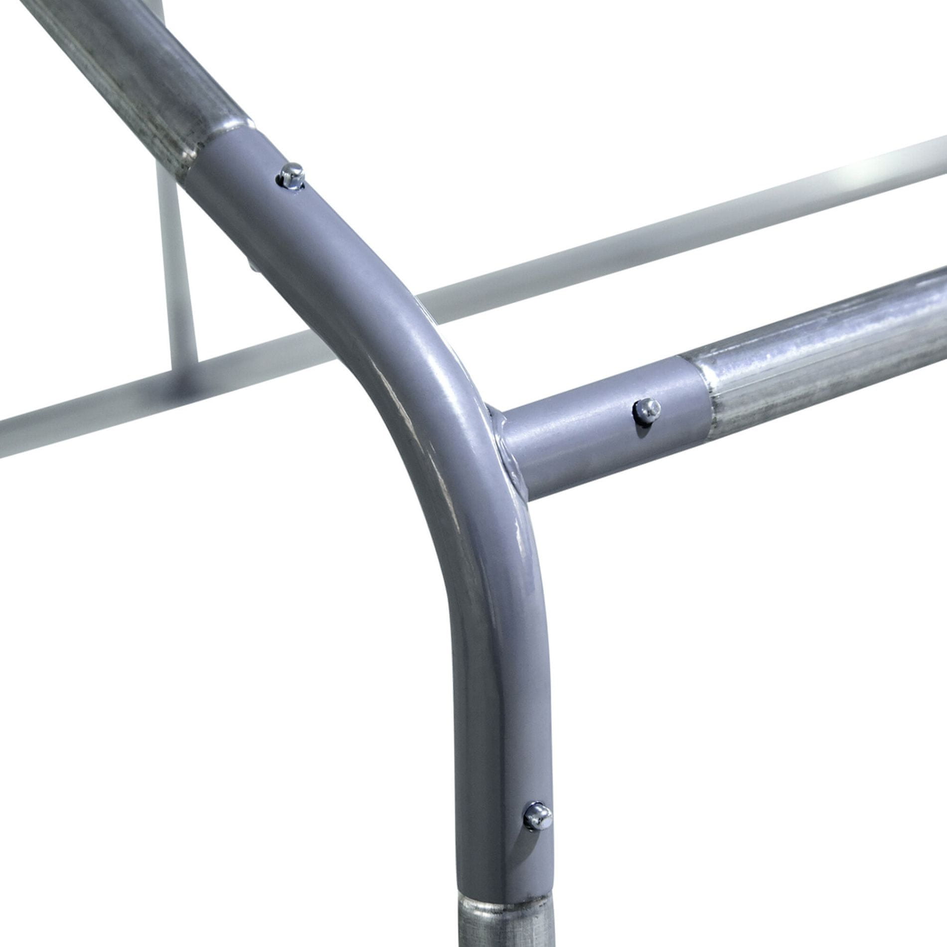 Kavez izrađen od čvrstog srebrnog pocinčanog čelika, koji osigurava stabilnost ograđenog prostora i sprječava neželjene ozljede, poput bijega vaše peradi. Konstrukcija je dopunjena s pocinčanom mrežom zelene boje i krovom, koji čini siva PVC cerada.