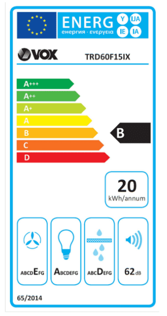 | Energetska učinkovitost | Razred energetske učinkovitosti (EEI): B Godišnja potrošnja energije: 19,8 kWh Potrošnja u isključenom stanju: 0,0 W EEIhood: 58,8 |