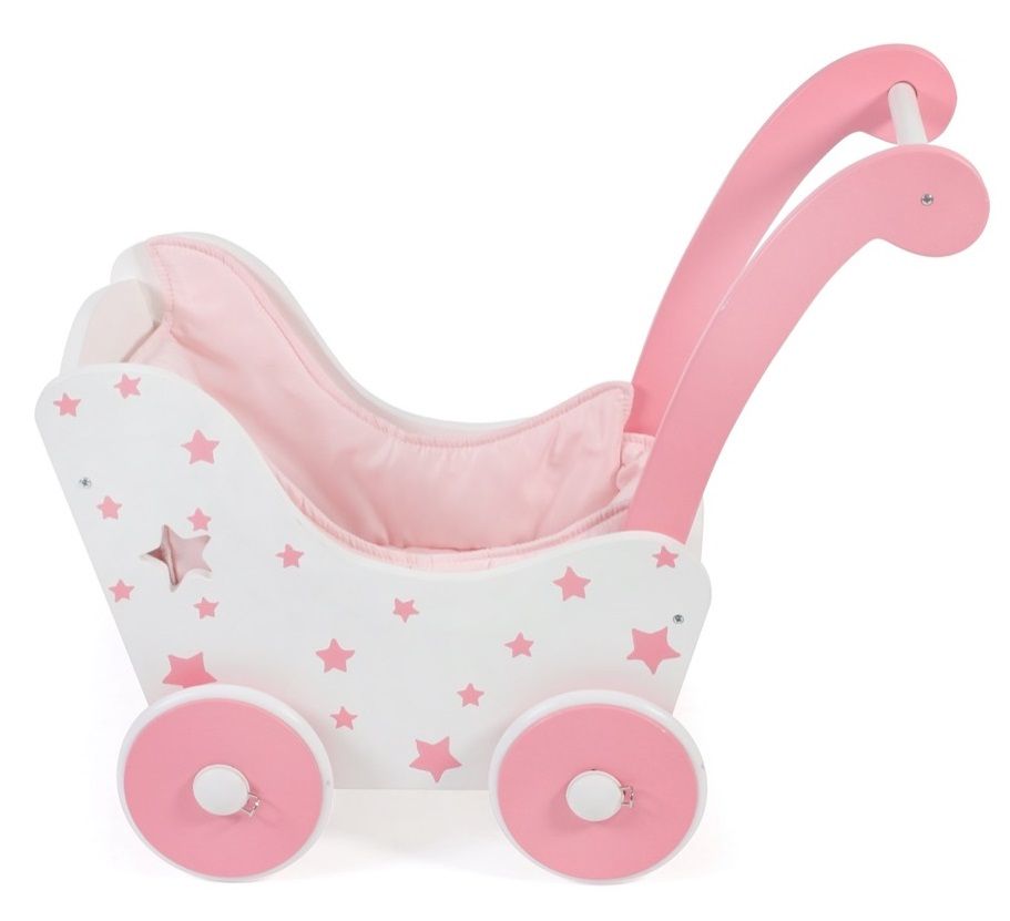 Drvena kolica za lutke lijepog dizajna izrađena su od visokokvalitetnog materijala. Kolica imaju meku tekstilnu oblogu. Beba također može sjediti u kolicima. Kotači nalaze se na čeličnim osovinama s gumenim kotačima. Cijeli opis