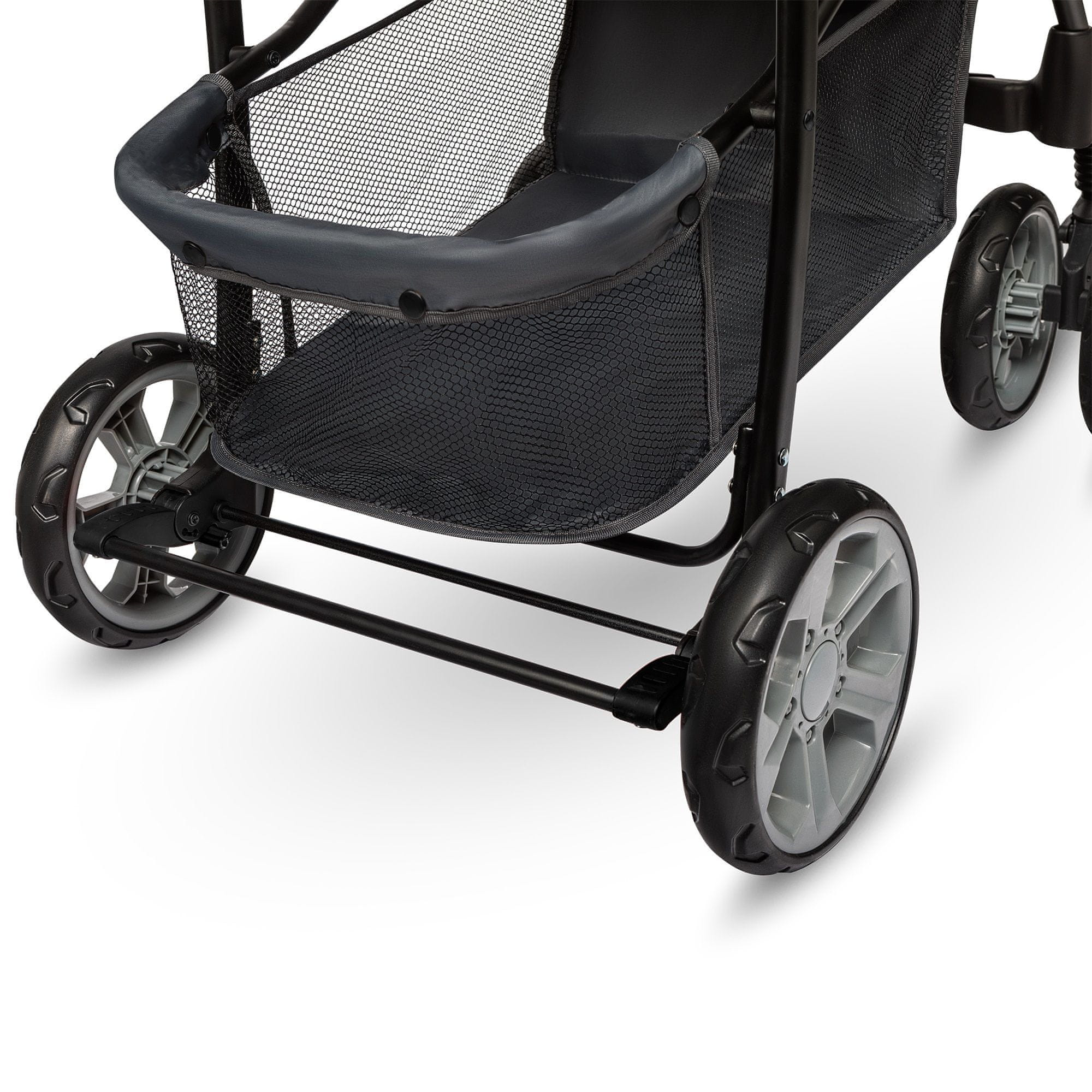 Donji dio kolica krasi prostrana i lako dostupna košara za kupovinu koja olakšava svakodnevne obveze. Prednji kotači s mogućnošću blokade za vožnju ravno i učinkovita amortizacija omogućuju glatko upravljanje, bilo da ste u trgovačkom centru ili na gradskom pločniku.