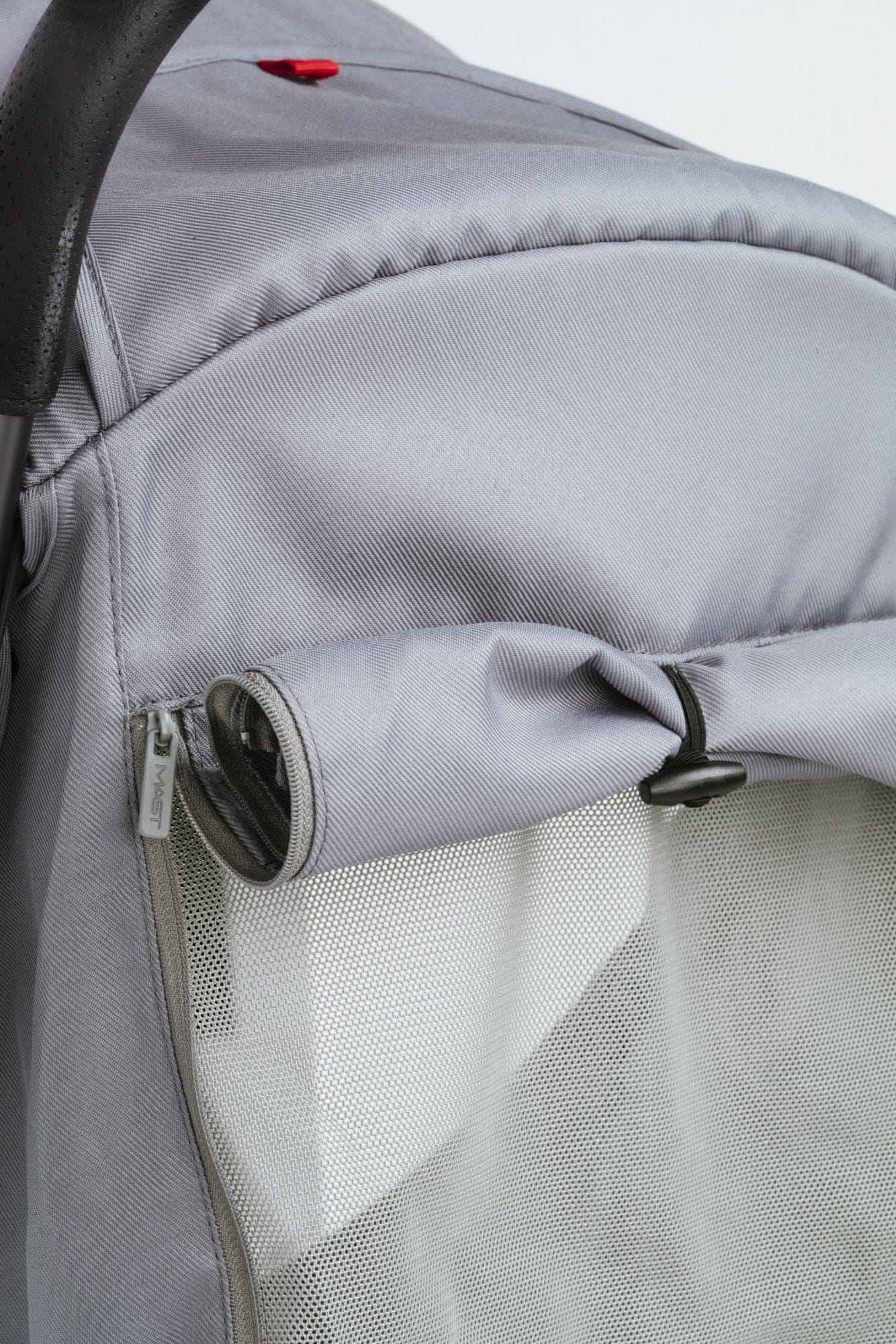 - Nadstrešnica nudi mališanu zaštitu od UV zraka sa ZF 50+. Veliki nadstrešnica može se dodatno produžiti pomoću patentnog zatvarača, što dodatno štiti vaše dijete u sunčanim danima. Prozračnost i optimalan protok zraka osiguravaju mrežasti prozori postavljeni na vrhu krova iu naslonu.