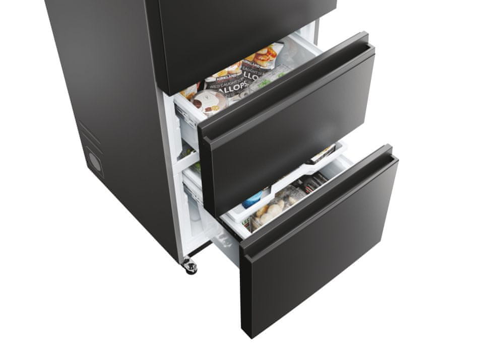 Haierov hladnjak s troje vrata ima impresivno dizajniran sustav ladica za zamrzavanje. U usporedbi sa sličnim hladnjacima s donjim zamrzivačem, štedi do 60% više energije i ima lakši pristup cijelom dijelu zamrzivača, koji se također znatno učinkovitije koristi. Namjenske zone hlađenja koje mogu kontrolirati temperaturu i/ili vlažnost i Fresher Techs® tehnologija jamče dugotrajno očuvanje kvalitete hrane kontinuiranim prilagođavanjem uvjeta hlađenja.