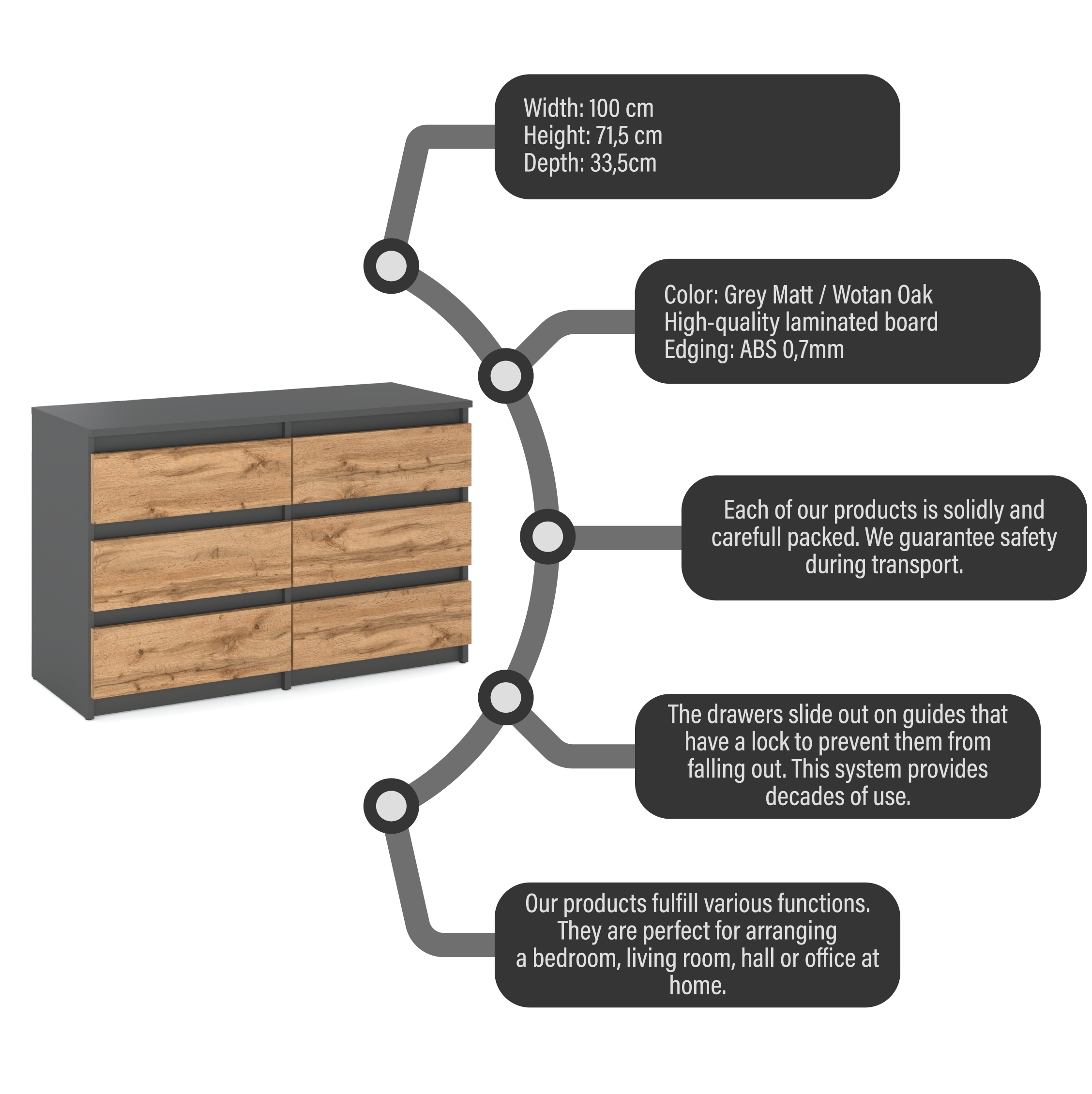Predstavljamo elegantnu i funkcionalnu Komodu mat sivi hrast Wotan sa 6 ladica, širine 100 cm – savršen izbor za vaš dnevni boravak, spavaću sobu ili hodnik. Pruža savršenu ravnotežu između modernog dizajna i praktičnosti, što je čini nezamjenjivim komadom namještaja za svaki moderni interijer. ⚙️Tehničke specifikacije: