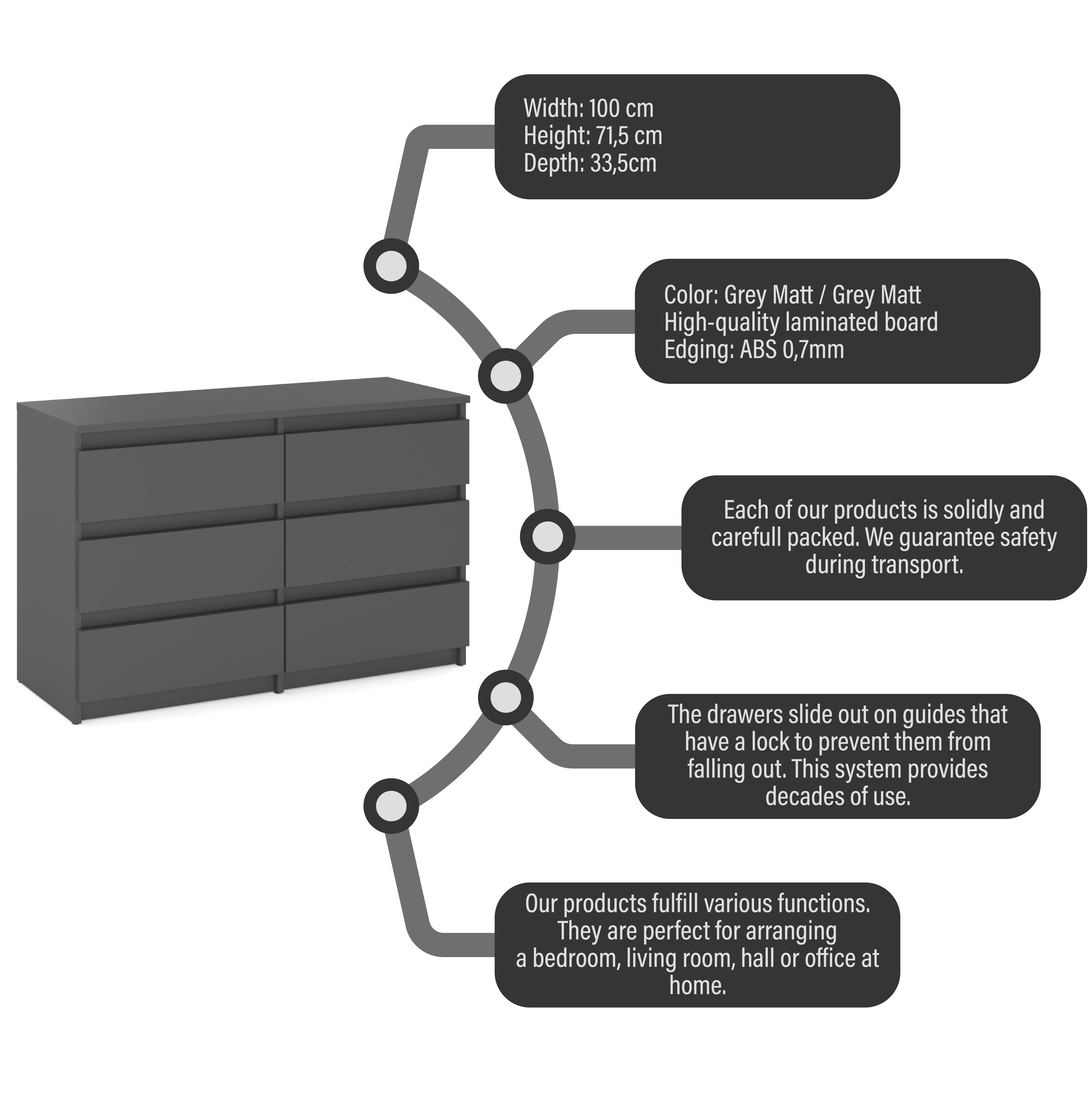 Predstavljamo elegantnu i funkcionalnu Mat sivu komodu sa 6 ladica, širine 100 cm – savršen izbor za vaš dnevni boravak, spavaću sobu ili hodnik. Pruža savršenu ravnotežu između modernog dizajna i praktičnosti, što je čini nezamjenjivim komadom namještaja za svaki moderni interijer. ⚙️Tehničke specifikacije: