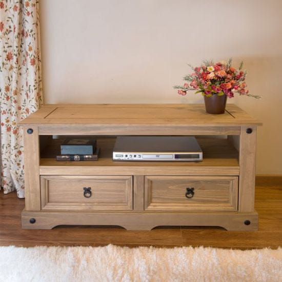 Komoda Brazil 7 izrađena od čvrstog borovog drveta rustikalnog je dodira. Ima dvije ladice i veću policu. Cijeli opis