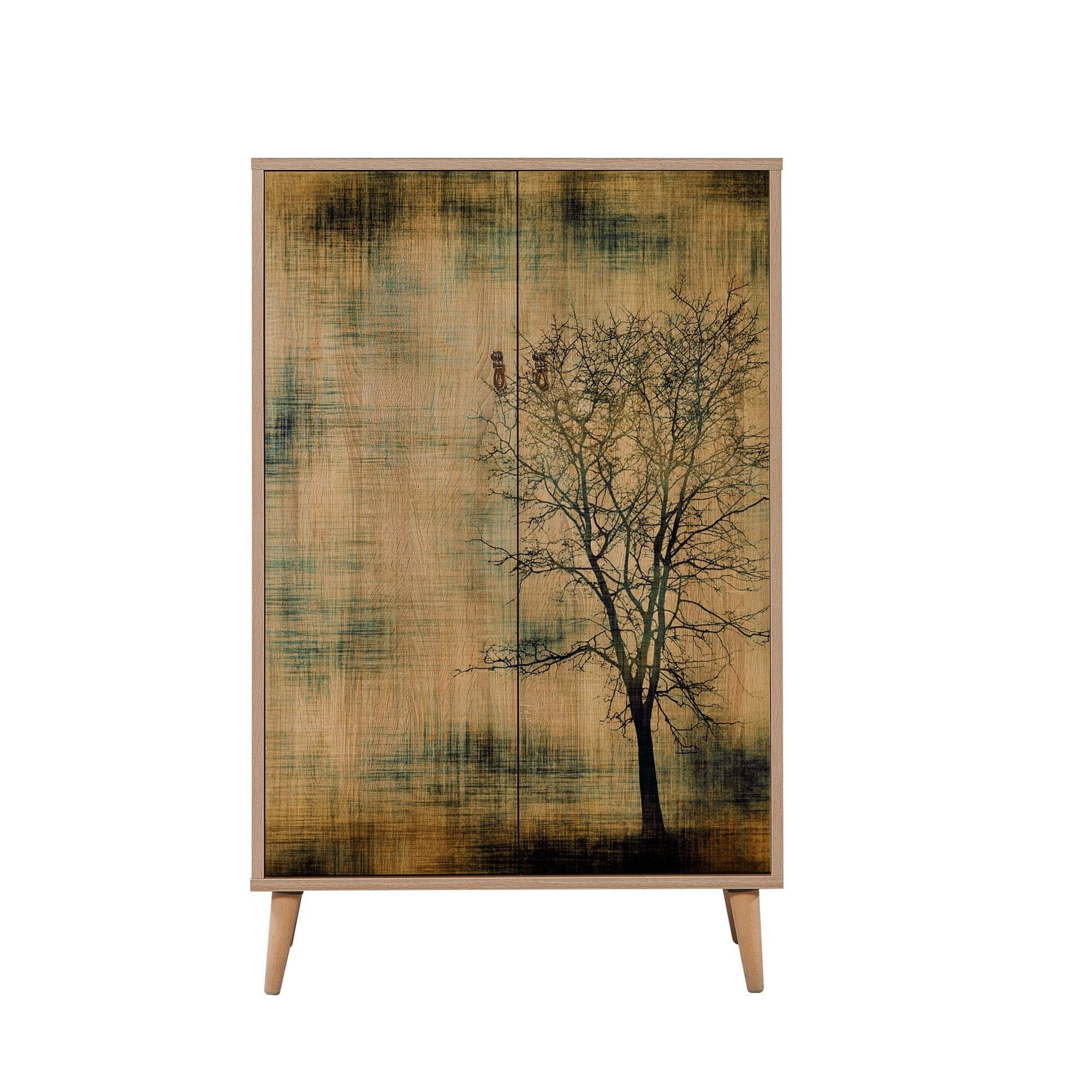 Moderna i praktična višenamjenska komoda sa uzorkom na vratima izrađena je od iverice presvučene melaminom. Ima noge od grabovog drveta. Ima metalne ručke i premazana je s UV zaštitom. Ima puno prostora za odlaganje, a ujedno je i dekorativni element u Vašem domu. Dimenzije: 80 x127 × 36 cm; Visina police: 25,5 cm, Visina nogu: 15 cm; Debljina materijala: 18 mm; Može se pričvrstiti na zid.