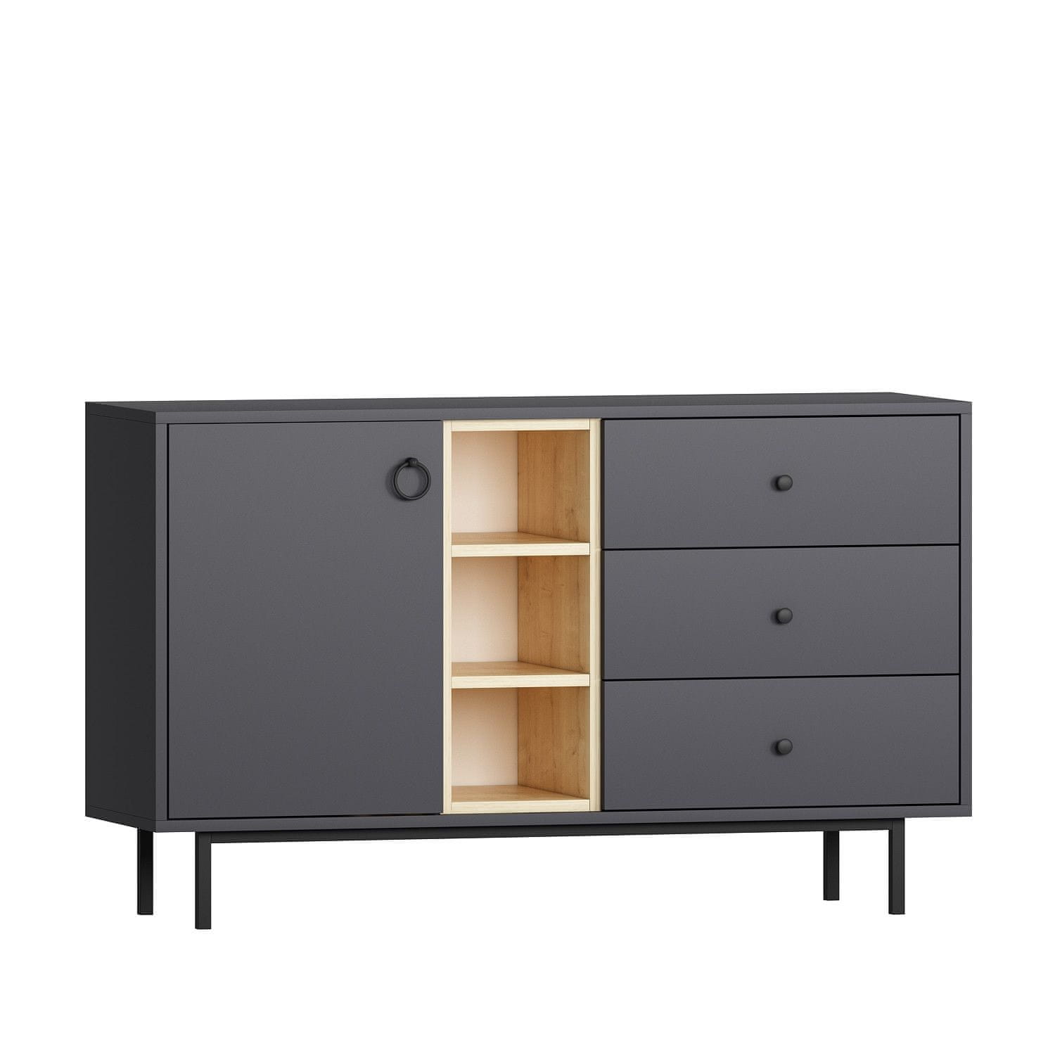 Dodajte dašak modernog stila u svoj prostor s komodom, Naturel – Anthracite. Ova elegantna i funkcionalna komoda nudi obilje prostora za pohranu uz tri praktične ladice i brojne police. Izrađena je od kvalitetnih materijala i savršena je za svaki dom. Fiksirajte je na zid za dodatnu sigurnost!