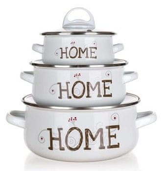 Set emajliranih lonaca je primjeren za kuhanje različitih jela. Emajlirani lonci su bijele boje i ukrašeni HOME dekorom. Stakleni poklopci su opremljeni plastičnim držačem za lakše rukovanje. Na dnu posude pronaći ćete odgovarajuće piktograme. Cijeli komplet možete prati u perilici posuđa. U setu su tri posude s poklopcima.
