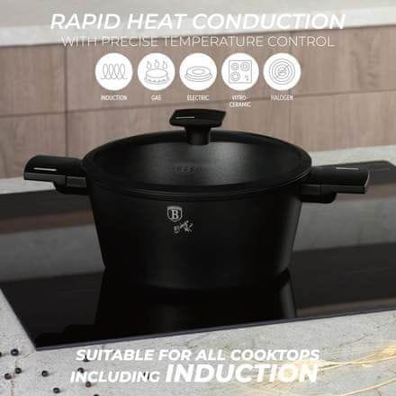 - Turbo indukcijska baza: Posuđe ima turbo indukcijsku bazu koja omogućuje korištenje na svim vrstama ploča za kuhanje, tako da ne morate brinuti se da ga nećete moći koristiti na svojoj novoj ploči za kuhanje.