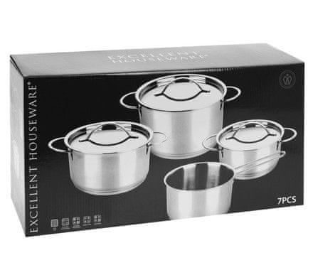 - materijal: nehrđajući čelik – ravnomjerna raspodjela topline po dnu i stijenkama lonca – izvrsna svojstva za kuhanje, pirjanje i prženje – profesionalni dizajn dizajniran za visoku funkcionalnost u kuhinji – robusna i vrlo izdržljiva obrada – dobro osmišljeni rubovi za izlijevanje za udobno izlijevanje sadržaja bez kapanja – ručke od nehrđajućeg čelika pričvršćene izvana, bez vijaka ili spojeva unutar lonca – ručke se ne mogu olabaviti i voda ne ulazi u njih, te se ne zagrijavaju tijekom kuhanja – mjerna skala u svakom loncu – lako se čisti, može se prati u perilici posuđa – pogodno za sve vrste štednjaka i indukciju – pogodno za pećnicu do 220°C – kompletan set od 7 dijelova uključuje: – lonac 17 × 8 cm / 1,3 litre – lonac s poklopcem 17 × 10 cm / 1,5 litre – lonac s poklopcem 19 × 10 cm / 2 litre – lonac s poklopcem 21 × 10 cm / 3 litre