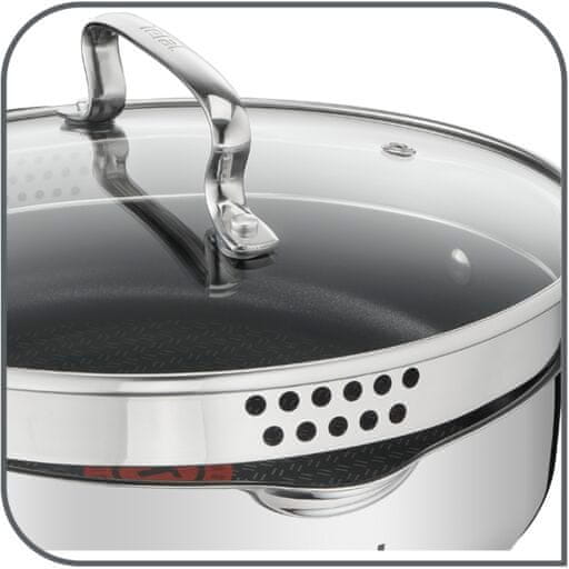 Set posuđa od nehrđajućeg čelika Duetto+ marke Tefal štedi vam puno vremena u kuhinji. Posude su izrađene od visokokvalitetnog nehrđajućeg čelika s praktičnim značajkama kao što su poklopci s rubom za cijeđenje ili lonci za nesmetano i čisto izlijevanje.