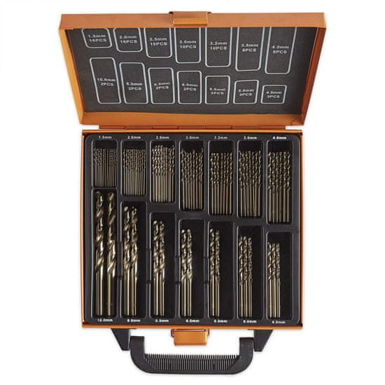 Komplet sadrži 99 svrdala od visokokvalitetnog čelika s 5% dodatnog kobalta.