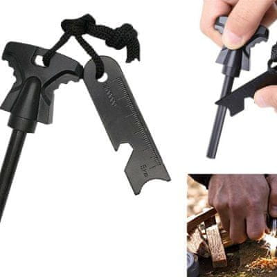 Praktičan magnezijev kremen. Izrađen je od posebne legure magnezija. Sve visi o koncu. Iskre vam omogućuju da zapalite vatru u bilo kojem vremenu i na bilo kojoj visini, čak i kada je kremen mokar. Opremljen tanjurom s otvaračem za boce i mjernom čašicom.