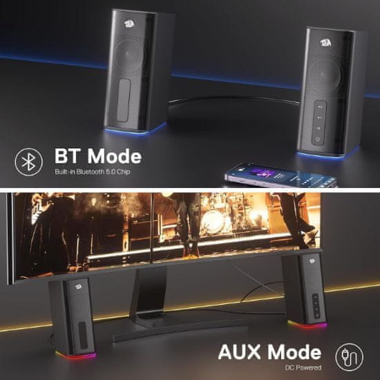 - Dinamičko RGB osvjetljenje: Zvučnici imaju zapanjujuću svjetlosnu traku s dinamičnim RGB osvjetljenjem koje nudi 4 različita načina rada, uključujući način sinkronizacije glazbe, za stvaranje savršene atmosfere.