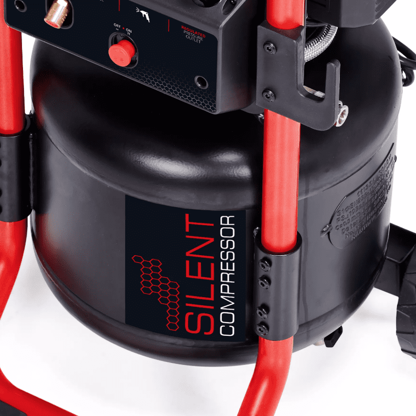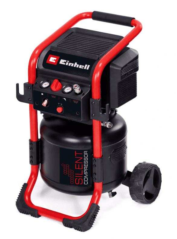 Einhell silent kompresor TE-AC 240/24 SILENT snage motora 1.500 W, usisnog kapaciteta do 240 l/min i spremnika kapaciteta 24 litre. 70 dB niža razina buke (LpA vrijednost) u usporedbi s konvencionalnim kompresorima. Okomiti dizajn omogućuje kompaktno skladištenje kompresora, čime se štedi prostor.