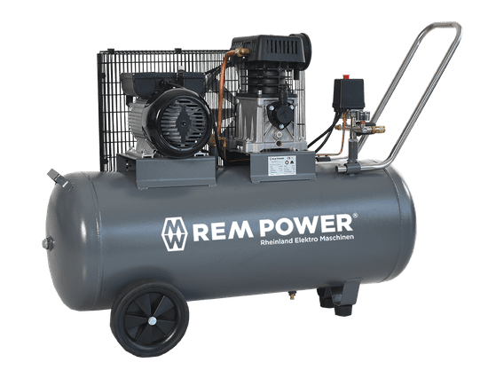 REM POWER E 349/8/100 je klipni kompresor sa 2-cilindričnom kompresorskom pumpom sa cilindrima od sivog lijeva, remenskim prijenosom i metalnom zaštitnom mrežom. Posjeduje hladnjak zraka, izravni priključak na tlačnu posudu, izlazni regulator tlaka s manometrom i dvije brze spojke.