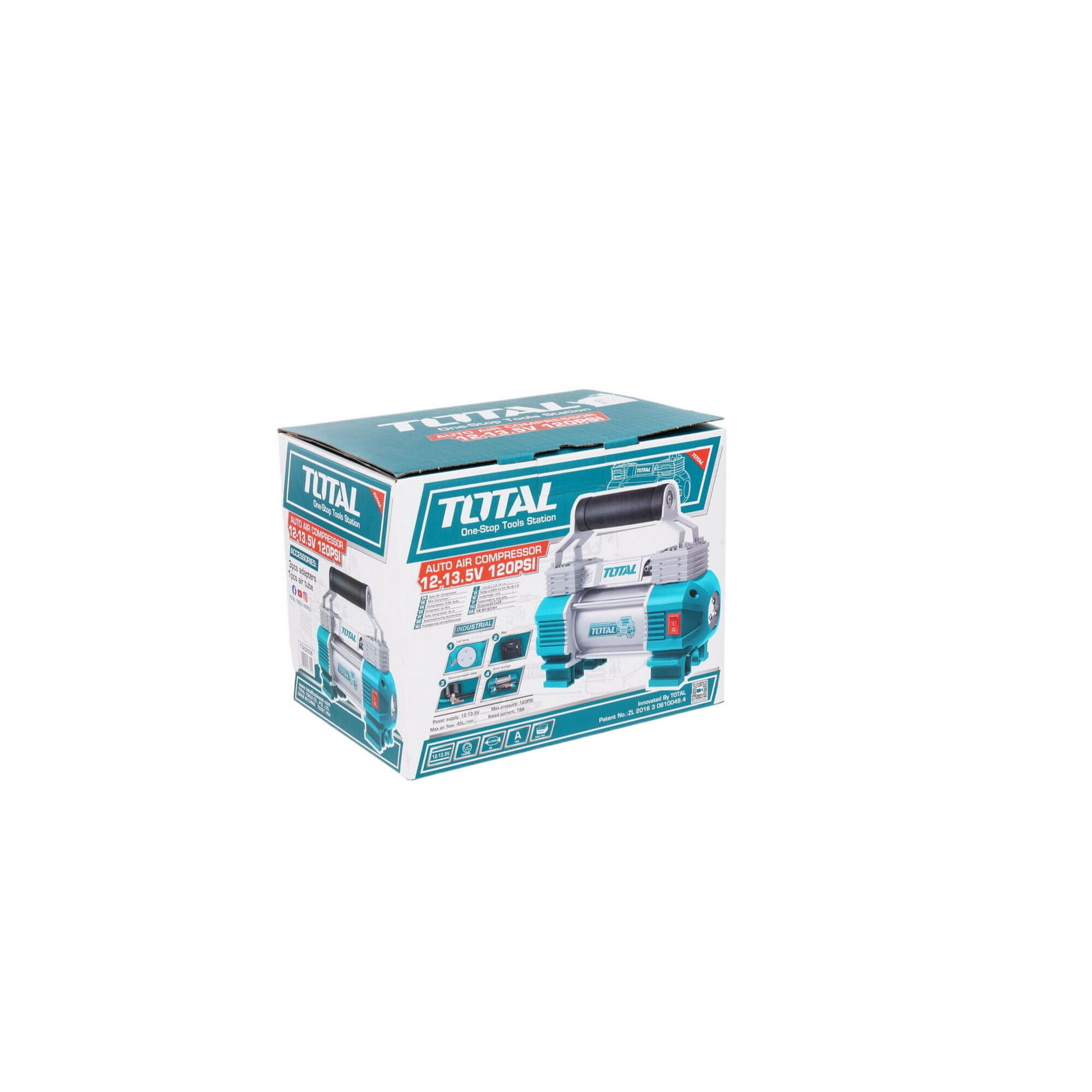 Automatski zračni kompresor TOTAL TTAC2506 s ugrađenom lampom je profesionalni alat za automobiliste. Namijenjen je punjenju guma kamiona, osobnih automobila, motocikala, bicikala. S njim možete napuhati i lopte ili čamce, dakle koristan je i u kućanstvu. Kompresor radi na 12V električnoj mreži s nazivnim strujnim opterećenjem od 18A. Istovremeno osigurava maksimalni radni tlak od 8 bara i neprekidno djelovanje do 15 minuta. Dostava zraka odvija se preko pet metara duge cijevi s brzim bakrenim adapterom, a napajanje je osigurano s napojnim kabelom za priključak na automobilski upaljač. Automobilski kompresor TOTAL TTAC2506 opremljen je sustavom LED indikacije te preciznim i pouzdanim manometrom. Komplet uključuje kliješta za izravnu vezu s automobilskom baterijom, iglu za lopte i platnenu torbu za pohranu i prenošenje kompresora.