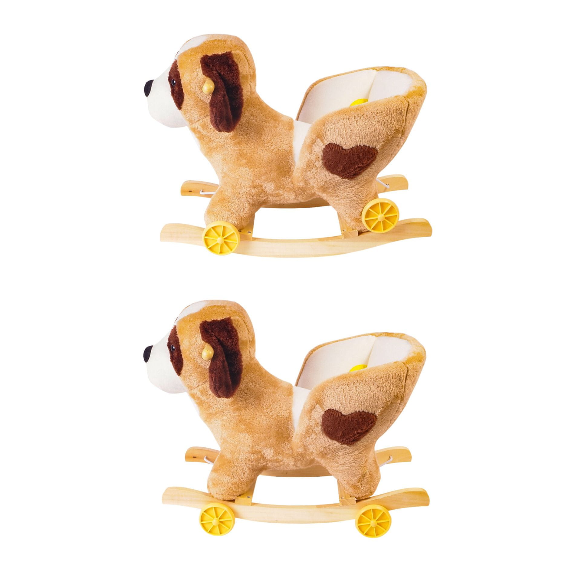 Čvrste drvene letvice i ručke pomažu djetetu održati ravnotežu. Jednostavnim mehanizmom na letvicama izvlačite kotačiće, čime u sekundi pretvarate ljuljačku igračku u psa na kotačima.