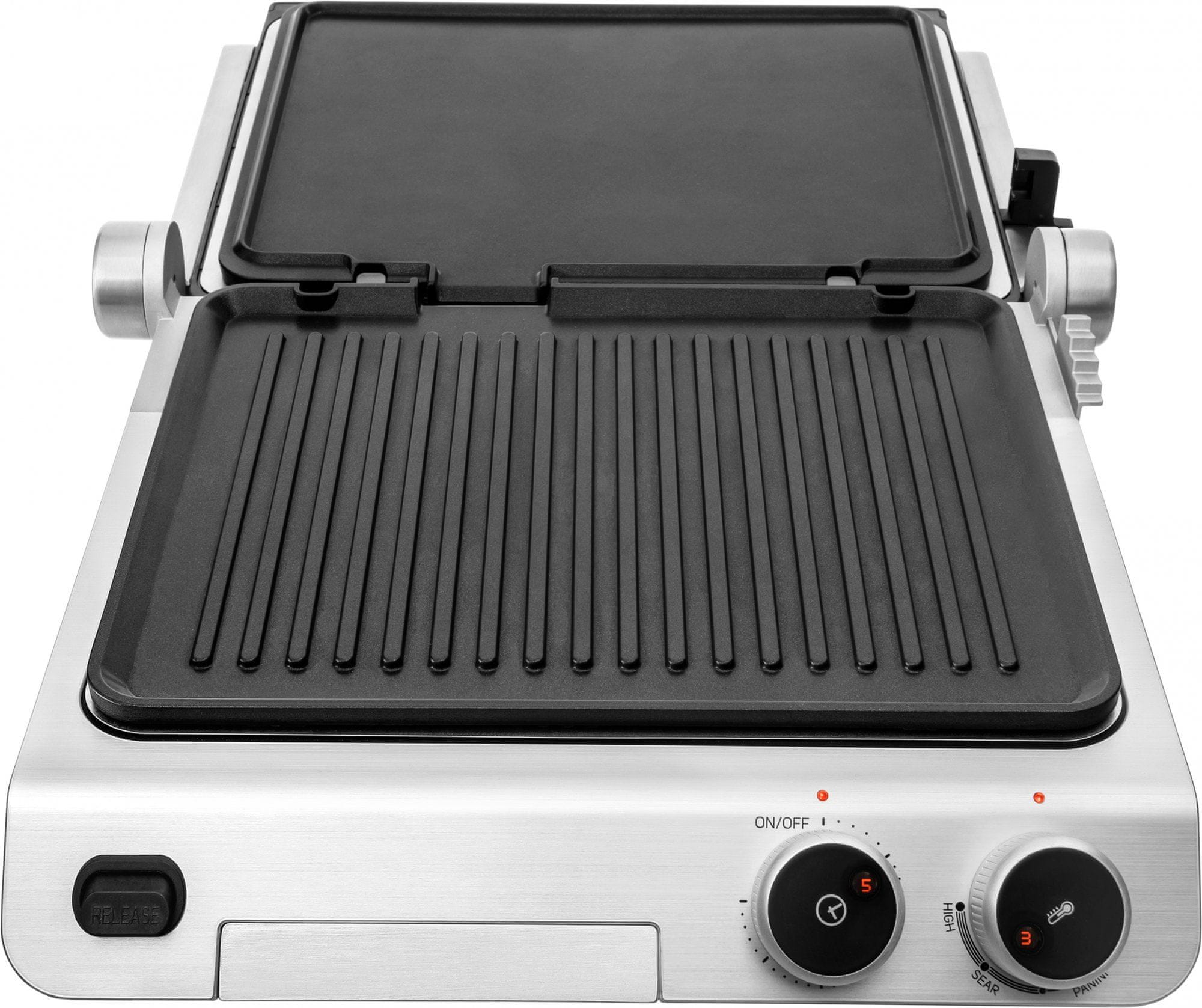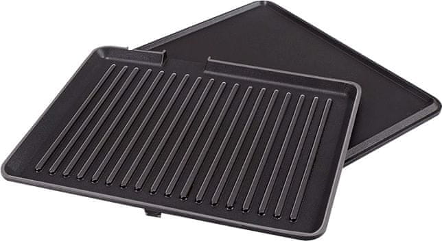 Dvije neljepljive ploče za premaz 3. generacije s ugrađenim grijaćim zavojnicama osiguravaju ravnomjernu pripremu hrane. Glatki vrh i nabrano dno osiguravaju udobno pečenje na roštilju. Roštilj se može rotirati pod kutom od 180° kako bi se povećala površina za pečenje.