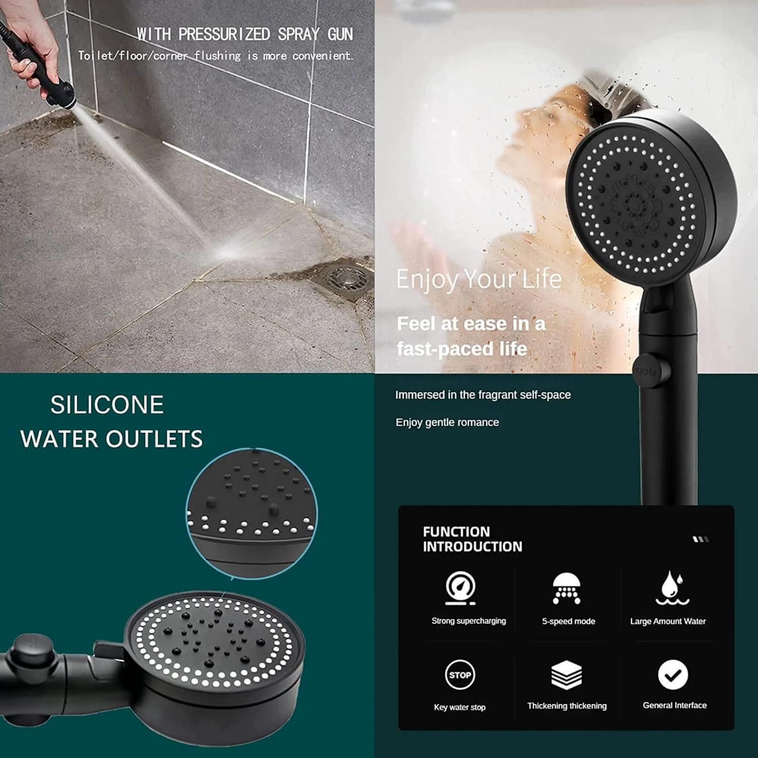 Crna glava tuša. Dizajniran za ugradnju u standardnu tuš cijev. Slušalica ima funkciju odabira načina tuširanja (5) i STOP funkciju koja zaustavlja protok vode. Ugrađeni ventilator povećava snagu tuširanja bez povećanja potrošnje vode.