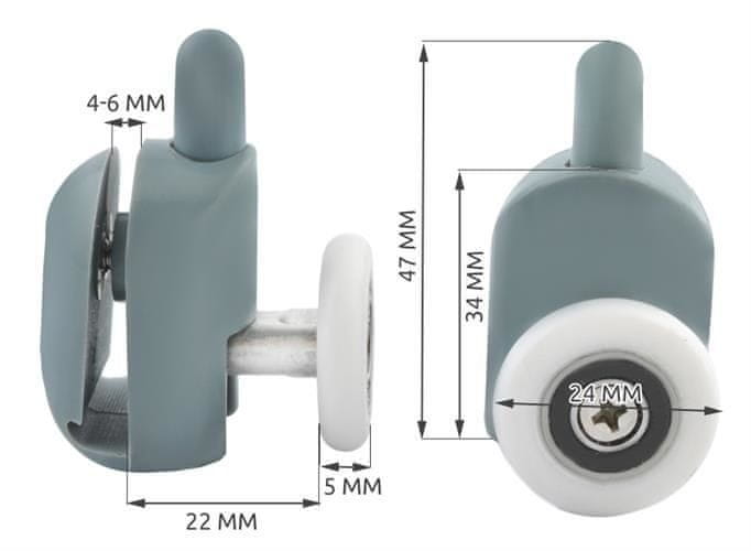 Set gornjih i donjih kotačića za tuš kabinu s čepovima i odbojnicima.Gornji valjak ima podesivi stezni element. Valjci su pričvršćeni na ležajevima, prikladni su za staklo debljine 4–6 mm, prikladni za različite tipove tuš kabina.