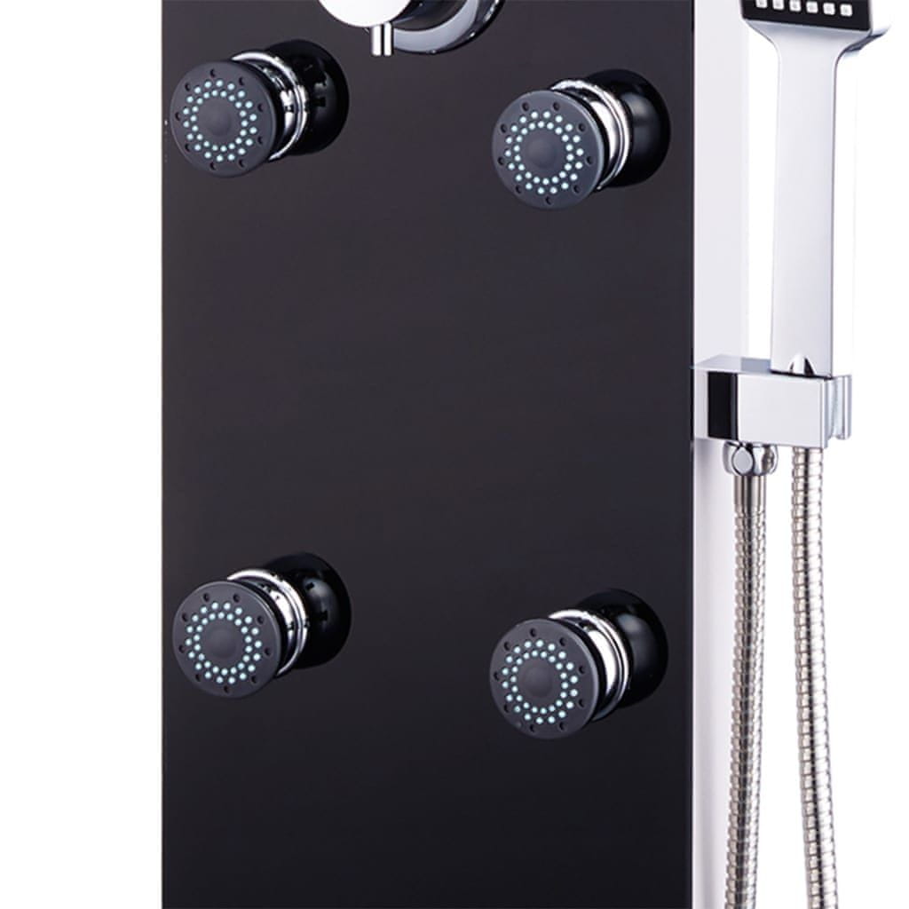 Toranj za tuširanje izrađen je od nehrđajućeg čelika i kaljenog stakla. Kaljeno staklo se proizvodi kontroliranim toplinskim ili kemijskim postupkom, što ga čini trajnijim i sigurnijim u usporedbi s normalnim staklom. Ima tri funkcije tuširanja: kišni tuš, masažni tuš i ručni tuš koji se lako može odabrati. Silikonske mlaznice su otporne na stvaranje kamenca. Uronite u istinski opuštajuće iskustvo tuširanja i uživajte u modernom stilu ovog lijepo dizajniranog panelskog sustava za tuširanje! Sklapanje je jednostavno.