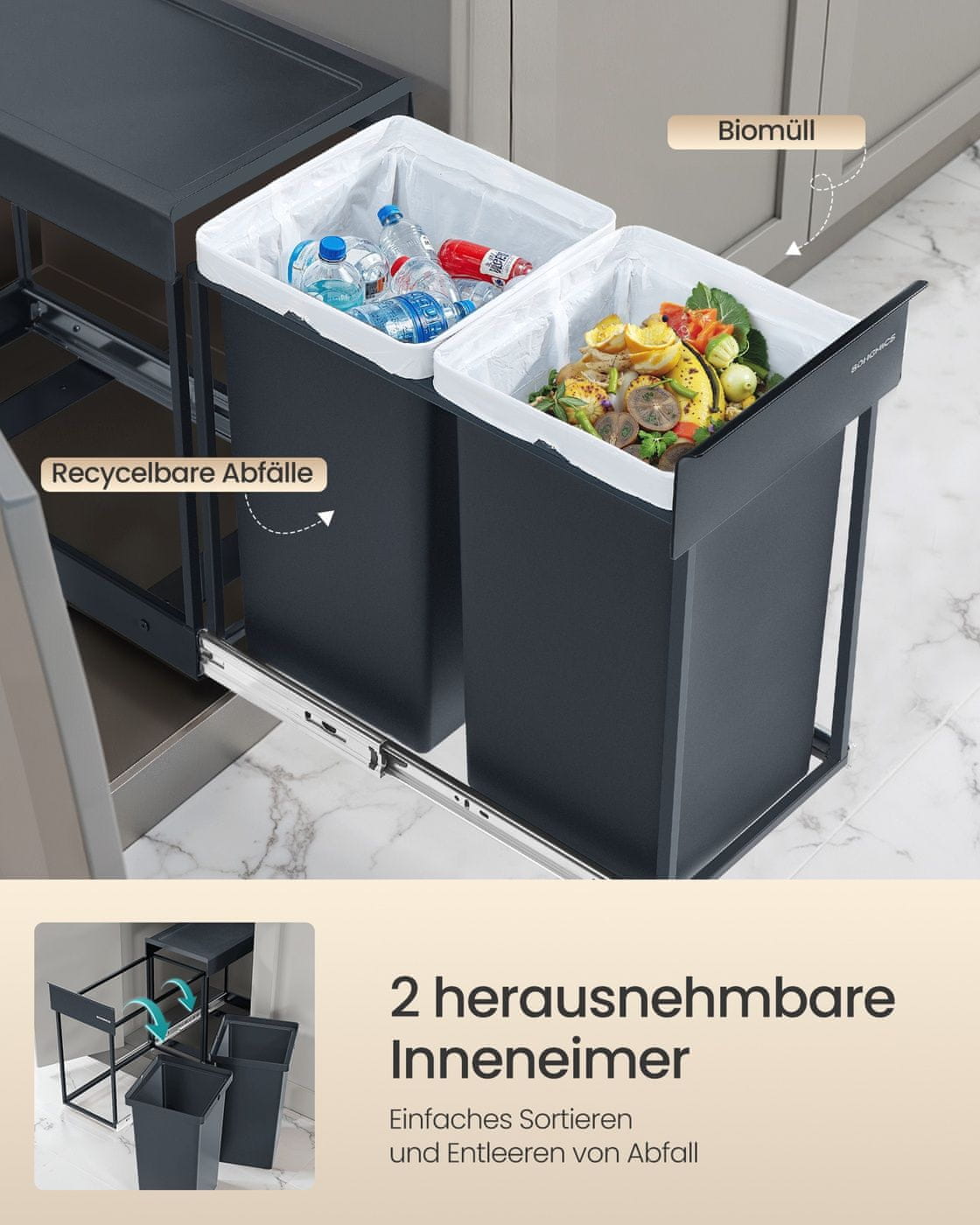 Ovaj praktični sustav za razdvajanje otpada dizajniran je za ugradnju u kuhinjske donje ormariće što olakšava učinkovito razdvajanje i upravljanje kućnim otpadom. Sadrži dva pretinca koja omogućuju praktično sortiranje reciklabilnog i općeg otpada. Mehanizam za izvlačenje i robusna konstrukcija osiguravaju glatko korištenje i dugotrajnu izdržljivost.