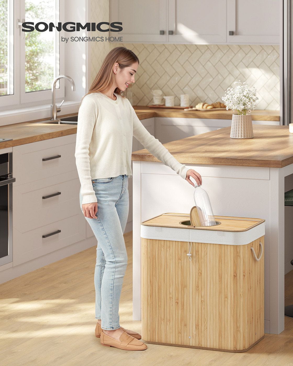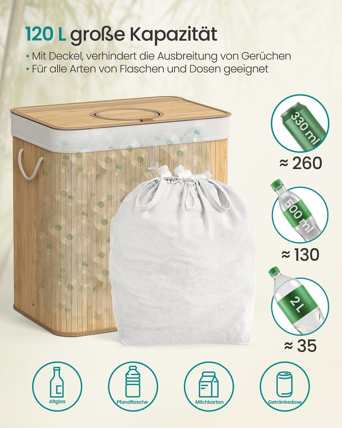 Ovaj praktični spremnik za reciklažu dizajniran je za prikupljanje boca s povratnom naknadom i drugih reciklabilnih materijala u vašoj kuhinji ili domu. Njegov moderan prirodni izgled skladno se uklapa u različite interijere dok velika zapremina čini ga idealnim za zauzeta kućanstva. Spremnik ima praktičan poklopac unutarnju vreću s ručkama za jednostavan transport i izrađen je od izdržljivih materijala za dugotrajnu upotrebu.