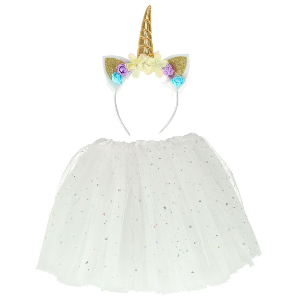 Kostim se sastoji od suknje i trake za glavu s jednorogom. Suknja s više slojeva ukrašena svjetlucavim zvijezdama. Savršena maska npr. na karnevalski ples. Kostim je izrađen od poliestera. Kostim je dostupan u bijeloj boji. Dugačka. suknja: 30 cm.