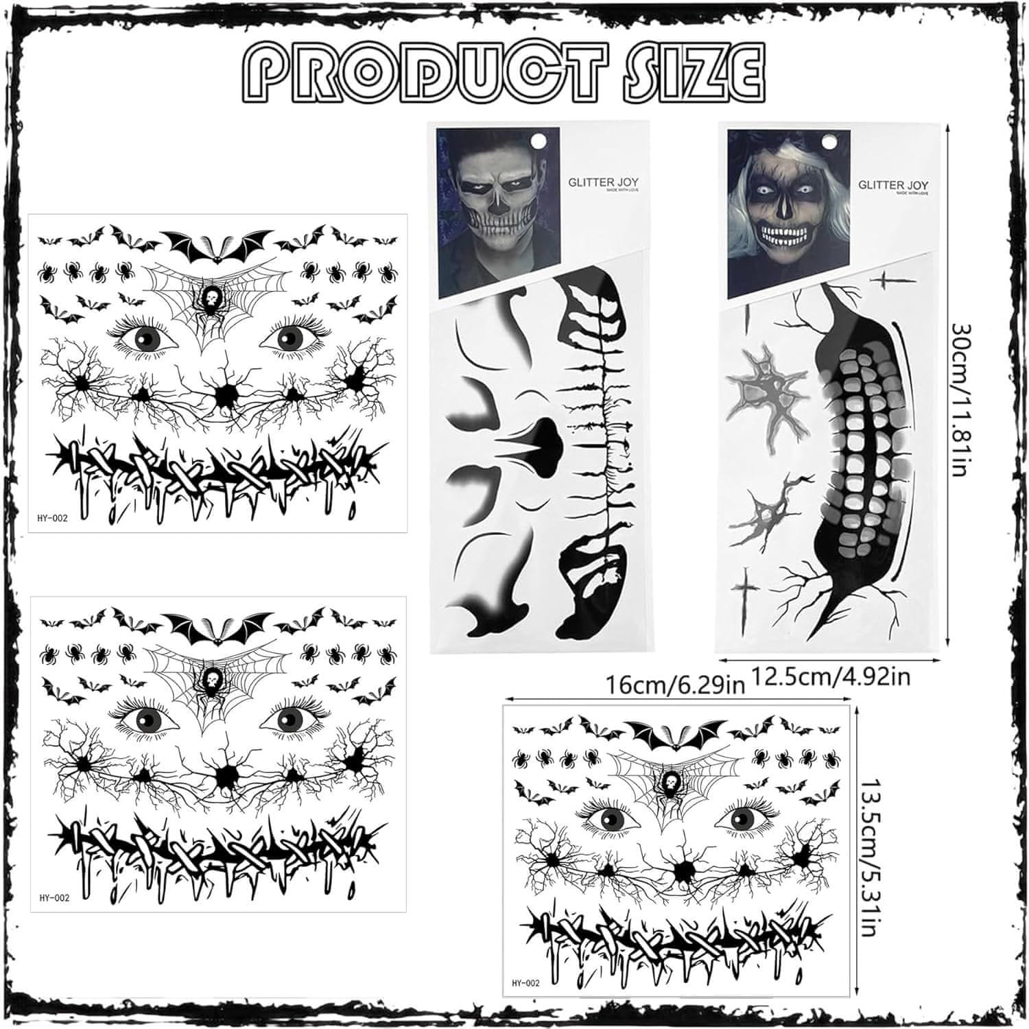 Kreirajte profesionalnu i zastrašujuću šminku u samo nekoliko minuta zahvaljujući ovom setu realističnih privremenih tetovaža. Zaboravite na dugotrajno i precizno oslikavanje lica bojama jer ova četiri arka s modernim uzorcima omogućuju postizanje efektnog izgleda bez nepotrebnog truda. U setu se nalaze raznoliki motivi poput mračnih osmijeha, realističnih ožiljaka, paukova te složenih elemenata kostura koji se savršeno prilagođavaju prirodnim konturama lica i usana. Ove privremene tetovaže dizajnirane su tako da budu sigurne za kožu te su prikladne za djecu i odrasle. Predstavljaju idealno rješenje za zabave povodom Noći vještica, karnevale i maskenbale, osiguravajući vizualno upečatljivu transformaciju koja će privući pažnju svih prisutnih na svakom događanju.