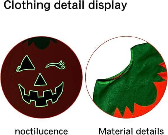 Utjelovite radosni simbol Noći vještica uz ovaj kompletni set kostima koji donosi veselje i prepoznatljiv stil svakoj proslavi. Glavni element ovog seta je elegantna narančasta pelerina izrađena od laganog i mekog poliestera, ukrašena kontrastnim zelenim ovratnikom u obliku lišća koji upotpunjuje izgled bundeve. Posebnost ovog modela je osvijetljeni uzorak nasmijane bundeve koji, nakon izlaganja sunčevoj svjetlosti ili umjetnom svjetlu, automatski svijetli u mraku koristeći princip fluorescencije. Labavi kroj tipa pelerine čini ovaj kostim iznimno svestranim, jer pristaje svakoj figuri i omogućuje nošenje toplije odjeće ispod, što je vrlo praktično tijekom hladnijih listopadskih večeri. Uz pelerinu, set uključuje i traku za glavu te torbu, čineći ga potpunim rješenjem za maskiranje.
