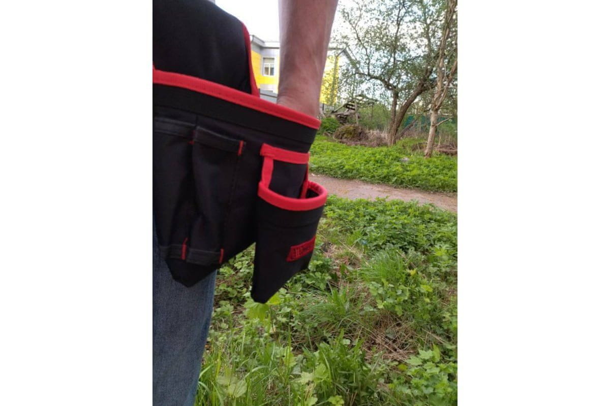 Dvostruka torba za pojas omogućuje nošenje svih osnovnih alata potrebnih za rad. Remen ima dvije torbe s džepovima i držač čekića, koji služe ne samo za nošenje alata, već i za organiziranje prikladnog pristupa njemu. Svi dijelovi remena izrađeni su od izdržljivog sintetičkog materijala.