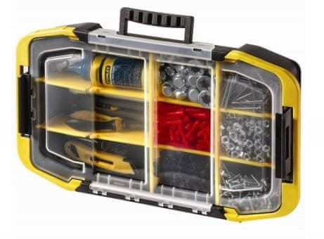 Stanley organizator je opremljen s izmjenjivim vijcima i spremnicima, koji se mogu rasporediti na bilo koji način. Prozirni poklopac olakšava pretraživanje spremljenog alata i štedi dragocjeno vrijeme.