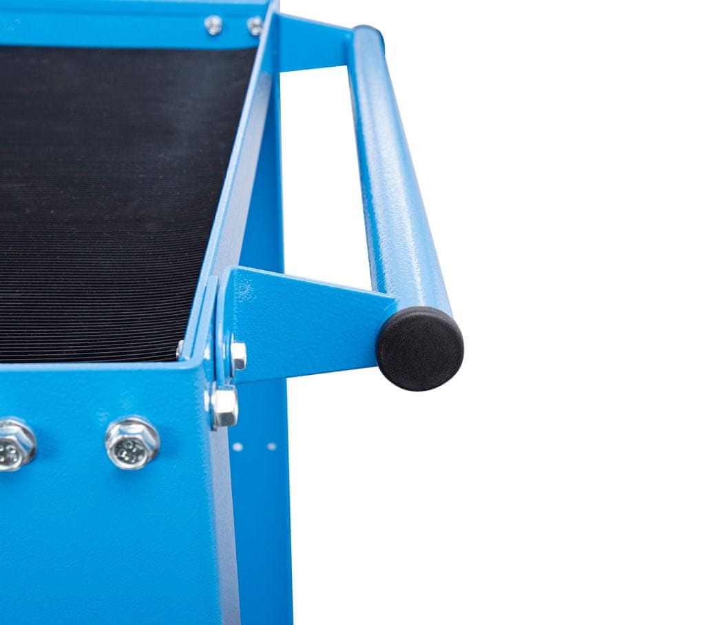 Industrijska servisna kolica omogućuju jednostavan transport i dostupnost alata u cijelom radnom prostoru, povećavajući produktivnost i udobnost na radu. Opremljena su s dvije vodootporne police, od kojih gornja ima protukliznu podlogu otpornu na udarce i osigurava sigurno skladištenje. Svaka polica može podnijeti do 100 kg, a ukupna nosivost je 200 kg. Zahvaljujući četiri kotača (2 fiksna, 2 okretna – jedan s kočnicom), kolica su izuzetno mobilna, stabilna i pouzdana.