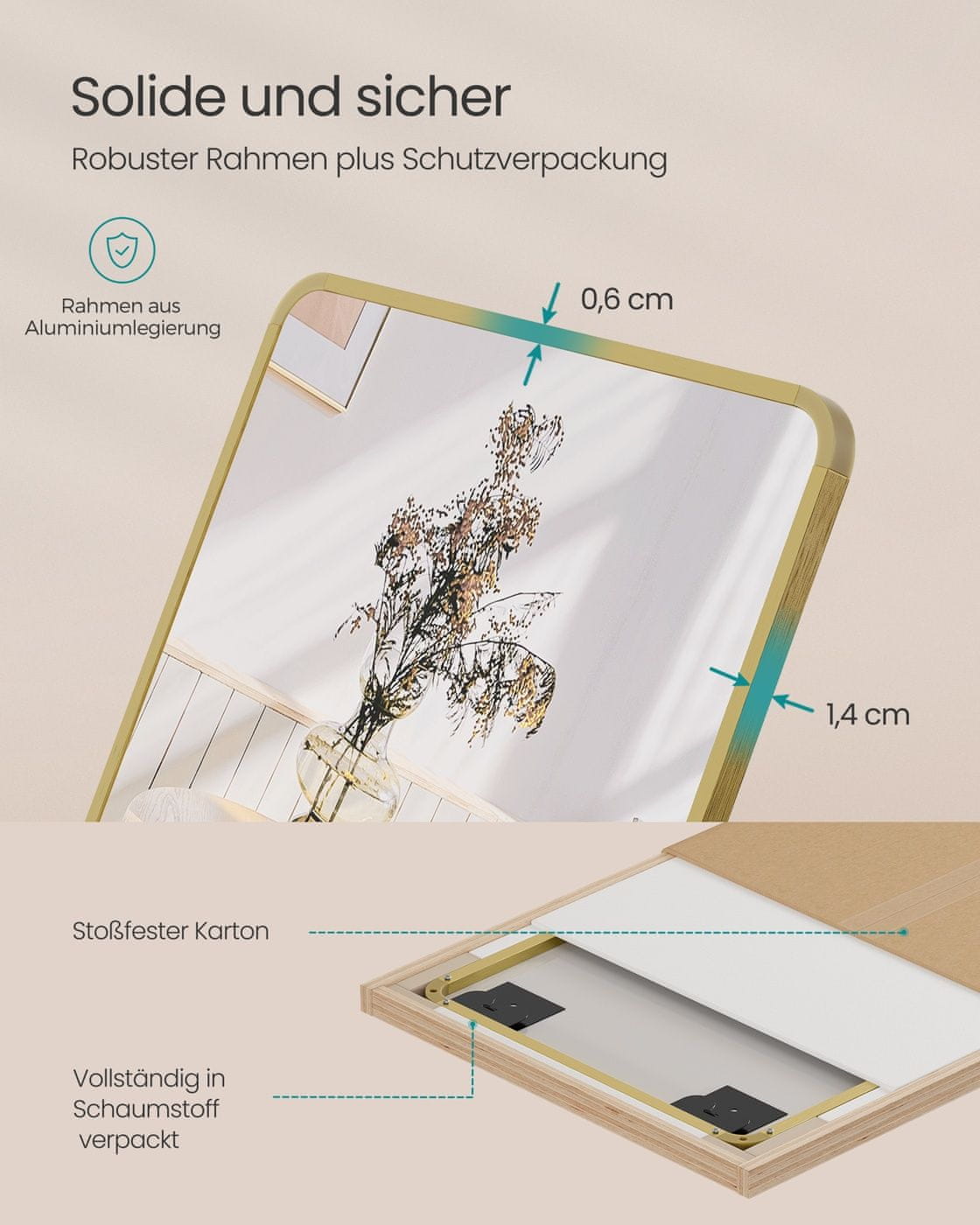Ovo ogledalo pune visine s čvrstim okvirom idealno je za spavaće sobe, dnevne boravke ili garderobe. Njegov elegantan dizajn dodaje moderan dodir svakom prostoru, pružajući jasan odraz za svakodnevnu upotrebu. Savršeno za provjeru odjeće od glave do pete.