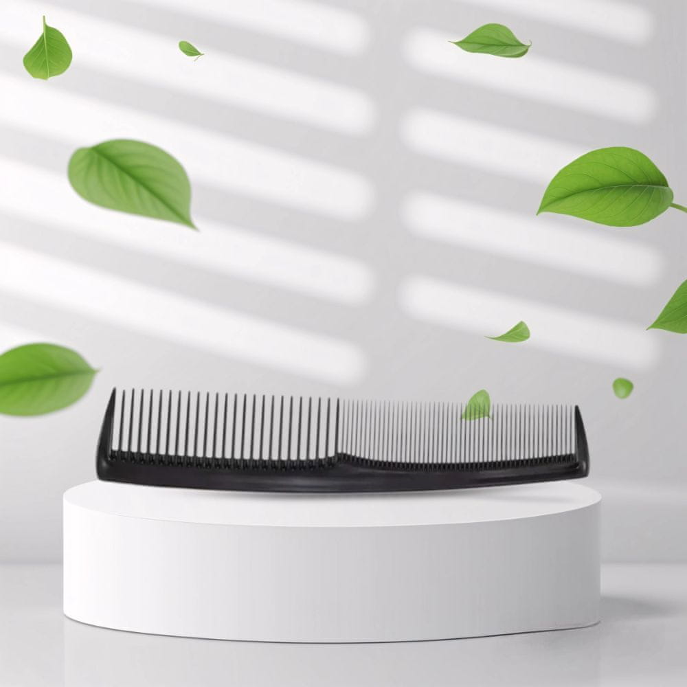 Obogatite svoj frizerski pribor fleksibilnim češljem za češljanje i šišanje, idealnim za profesionalnu i kućnu upotrebu. Ovaj svestrani češalj u elegantnoj crnoj boji savršen je za raščešljavanje kose na suho i mokro. Njegovi gusto raspoređeni zupci izvrsno su prikladni za precizno češljanje kratke i srednje duge kose, što ga čini nezamjenjivim alatom u svakoj kupaonici ili frizerskom salonu. Češalj je izrađen od visokokvalitetnih materijala, što osigurava njegovu trajnost i fleksibilnost. Zahvaljujući tome, otporan je na lomljenje i savršeno će se pokazati u svakodnevnoj upotrebi. Njegov ergonomski dizajn čini ga udobnim za korištenje, a njegova lagana konstrukcija omogućuje jednostavno i precizno podrezivanje kose, kako na suho, tako i na mokro.
