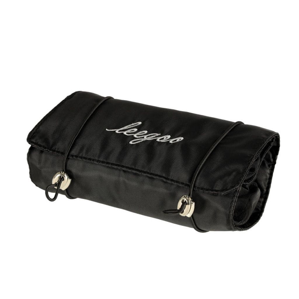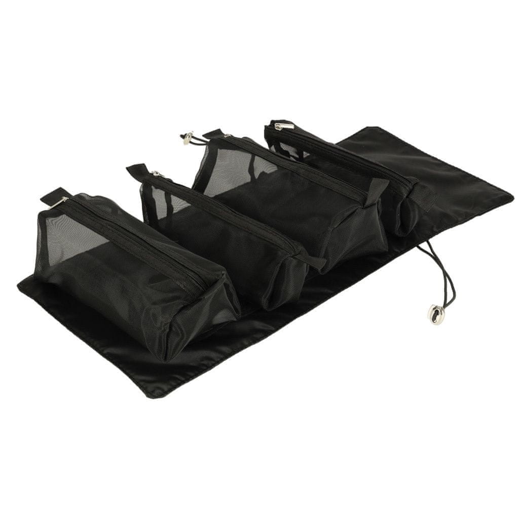 Crna putna kozmetička torbica - može se smotati kako bi zauzimala manje mjesta u prtljazi. Ima četiri pretinca koja se mogu izvaditi. Zidovi pretinaca izrađeni su od mrežaste tkanine koja olakšava pronalaženje proizvoda i također osigurava dobro prozračivanje mokrih omota.