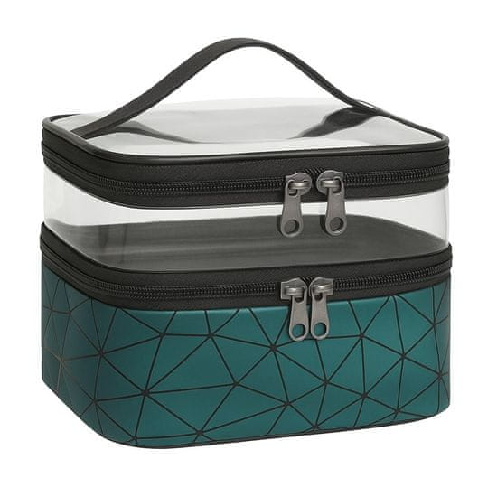 Kozmetička torbica – prostrana, ručka za nošenje u ruci, pretinac za četkicu, geometrijski dizajn, prozirni vrh, dva pretinca na patentni zatvarač, dimenzije 9 × 23 × 15,5 cm