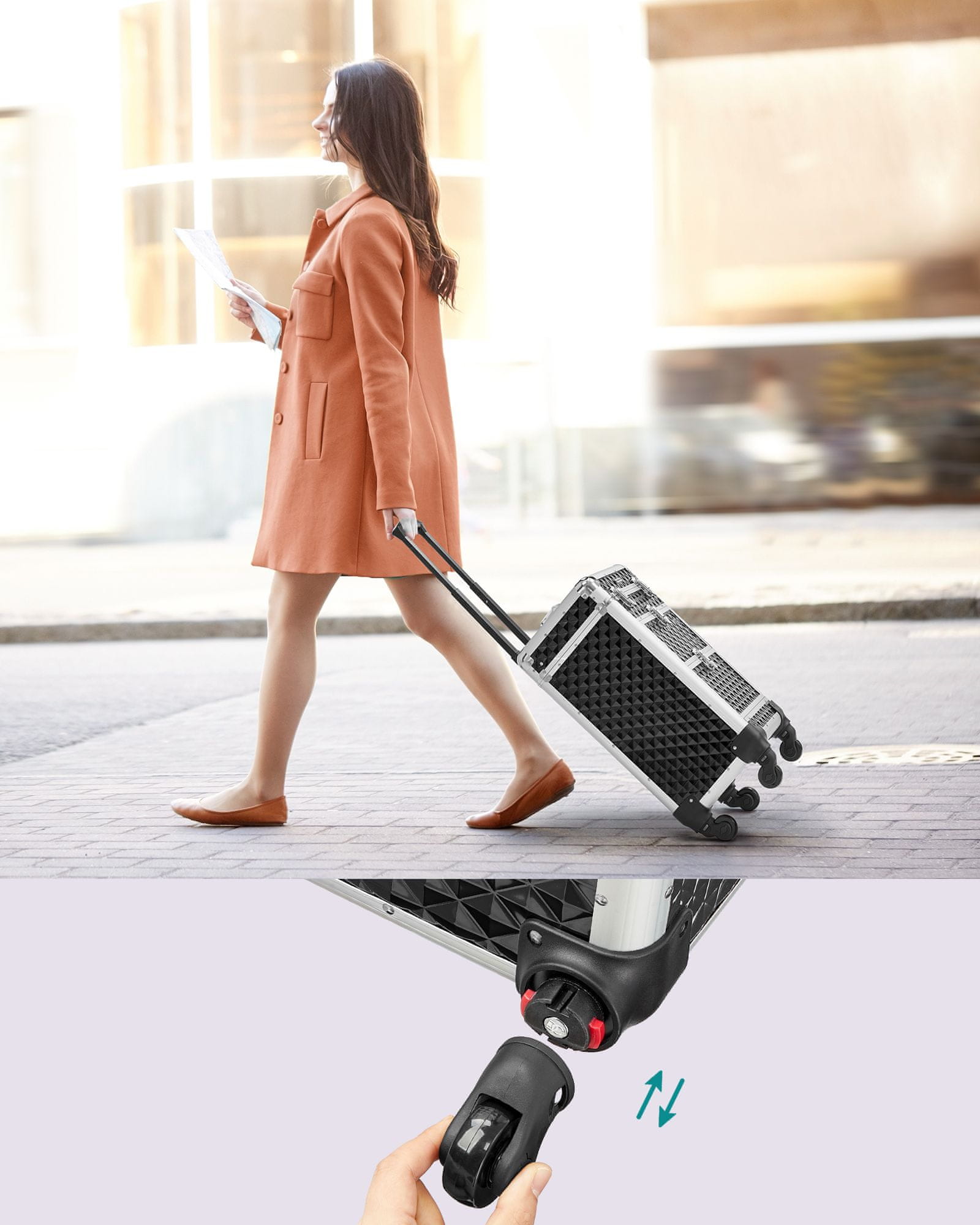Ovaj kozmetički kofer na kotačima dizajniran je za profesionalne vizažiste kozmetičke salone i nail tehničare kojima je potrebna organizirana prijenosna pohrana za njihove alate i proizvode. Njegov višeslojni dizajn s automatski otvarajućim ladicama i kliznim pretincima omogućuje brz pristup kozmetici i dodacima što ga čini idealnim za putovanja i rad u studiju. Čvrsta konstrukcija i mogućnost zaključavanja pomažu u zaštiti i sigurnosti vrijednih predmeta. Materijal: aluminijska legura akrilonitril butadien stiren plastika (ABS) poliesterska tkanina Dimenzije: 34×25×57cm Boja: crna Duljina (cm): 34 Visina (cm): 57 Dubina / širina (cm): 25 Materijal (detalj): metal – aluminij Materijal (detalj): plastika