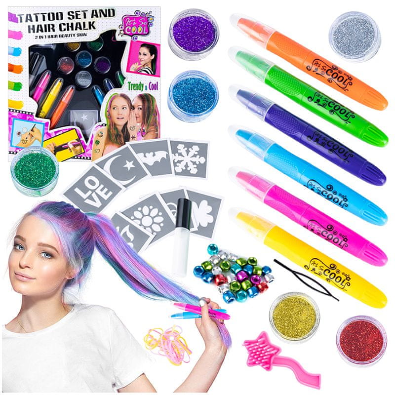 Sadržaj seta: – 6 kreda markera za bojanje kose – 6 šljokica u boji za izradu tetovaža – svjetlucavo ljepilo – 8 šablona za tetoviranje – perle za kosu