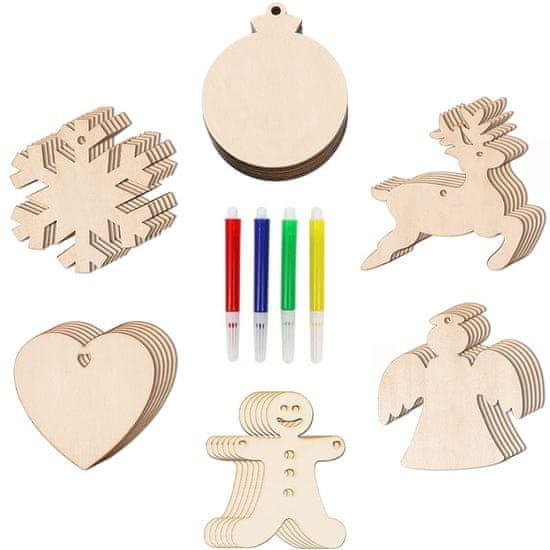 Nikcorp Drveni Božićni Ukrasi za Bor DIY Set 36 kom, za bojanje i ukrašavanje, s flomasterima i jutom, prirodno drvo